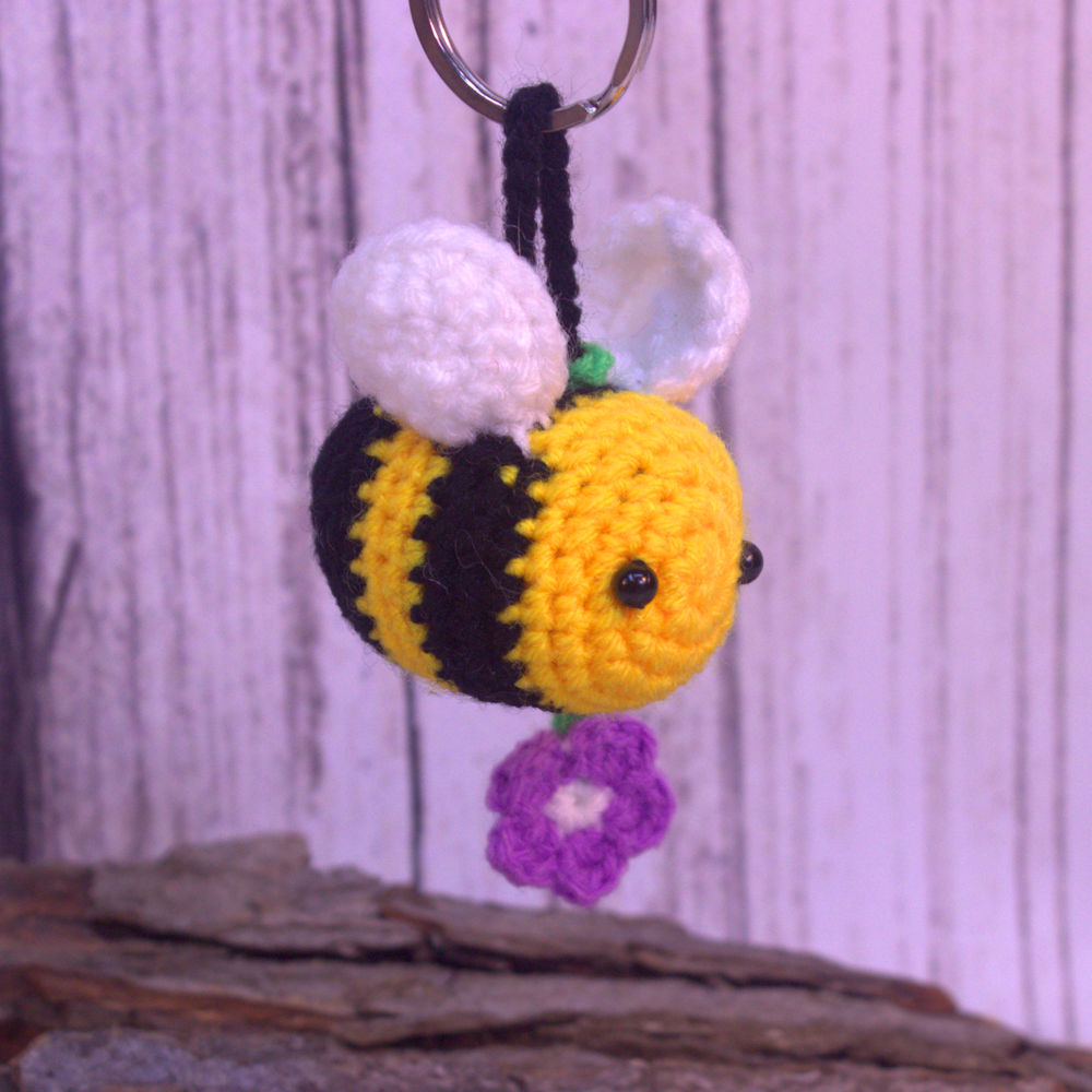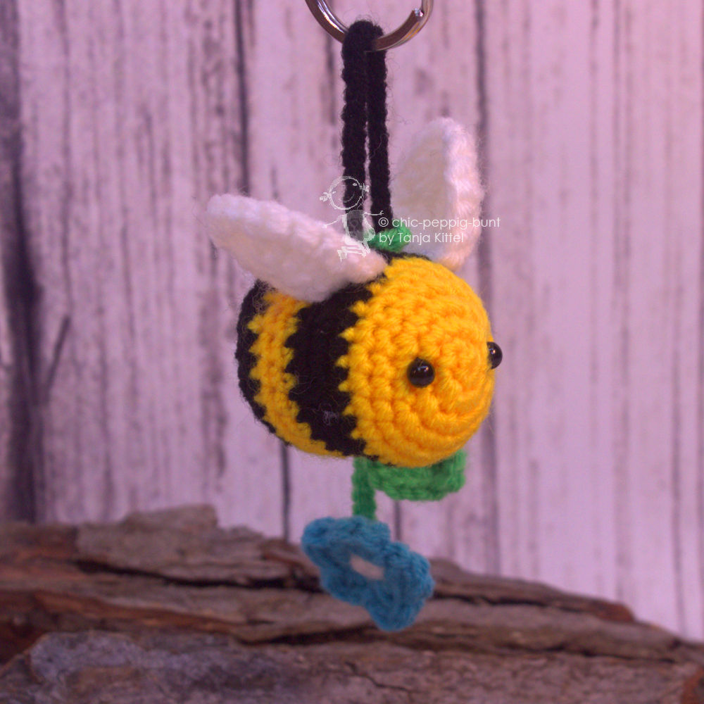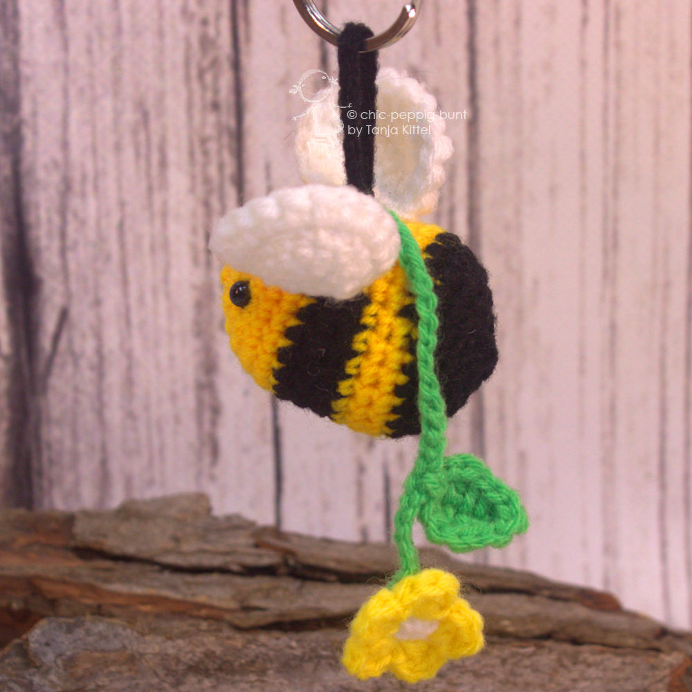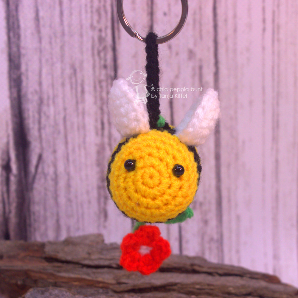Wenn sie Farbe in Ihr Leben bringen wollen, klappt das mit Hilfe dieses bunten Schlüsselanhängers bestimmt. Er hat die Form einer Biene, hat lustige gelb-schwarze Streifen und weisse Flügel. Das I-Tüpfelchen sind die kleinen schwarzen Knopfaugen und eine kleine bunte Baumelblume. Die Biene ist mit viel Liebe zum Detail mit vielen feinen gleichmäßigen Maschen gefertigt. Am stabilen Schlüsselring können sie sie sicher befestigen, aber auch am Autospiegel macht sie eine gute Figur. Und mit Hilfe der Biene finden sie ihre Schlüssel in jeder Handtasche gleich viel schneller.