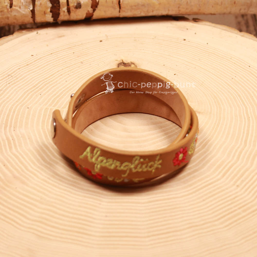 Dieses schicke Trachtenaccessoire ist kein gewöhnlicher Schmuck. Wir lassen das weiche Kunstleder hochwertig mit filigranen Blumen besticken. In der Mitte prangt stolz der Schriftzug „Alpenglück“. Man fertigt das Band als modernes Doppel- oder Wickelarmband, was am Handgelenk besonders lässig aussieht. Das Band besitzt eine Breite von 1,5 cm, was genau die richtige Balance zwischen Stabilität und feiner Optik bietet. So fühlt sich der Nachwuchs ganz groß, während der Trachtenschmuck sicher und bequem sitzt. Das glatte Kunstleder ist zudem sehr pflegeleicht – falls beim Schlemmen mal ein Tropfen Limonade danebengeht, wischt du ihn einfach weg.