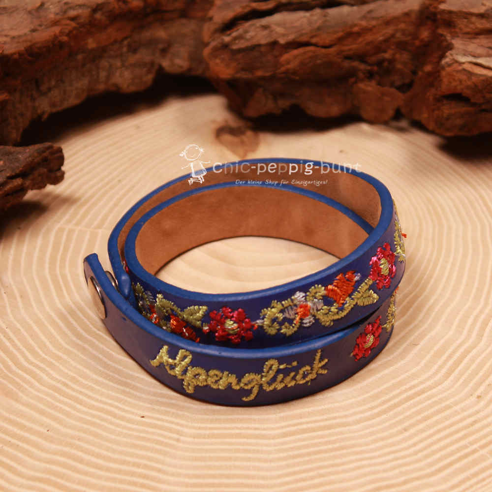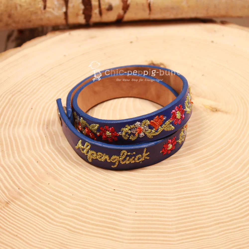 Dieses Trachtenzubehör ist weit mehr als nur ein einfacher Schmuck. Wir lassen das geschmeidige Kunstleder hochwertig mit bunten Blumen besticken. In der Mitte prangt stolz der Schriftzug „Alpenglück“. Man fertigt das Band als modernes Doppel- oder Wickelarmband, was am Handgelenk besonders lässig wirkt. Mit einer Breite von 1,5 cm bietet das Band die perfekte Mischung aus Robustheit und kindgerechter Optik. So fühlt sich der Nachwuchs wie ein Profi-Alpinist, während der Trachtenschmuck bequem sitzt. Das glatte Material punktet zudem bei der Pflege: Falls beim Schlemmen mal ein Tropfen Limo danebengeht, wird er einfach mit einem Tuch weggewischt.