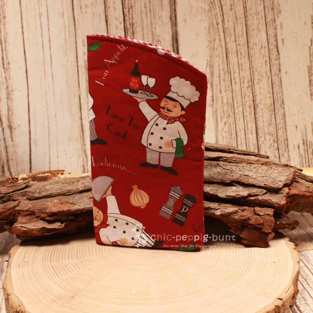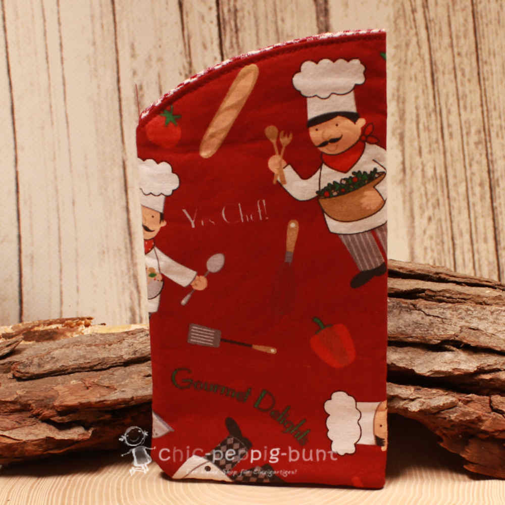 Wir lieben originelle Details und haben uns für dieses Modell ein besonders schmackhaftes Design ausgesucht. Die Außenseite besticht durch einen hochwertigen Stoff in edlem Dunkelrot, auf dem ein fleißiger Koch als Motiv den Ton angibt. Passend dazu servieren wir ein traditionelles Innenleben: Ein dunkelrot-weiß karierter Stoff schmiegt sich sanft um deine Gläser. Dieser weiche Innenstoff schützt die empfindlichen Oberflächen deiner Sehhilfe zuverlässig vor Staub und fiesen Kratzern. Jede Naht wird von uns sorgfältig handgenäht, damit das Etui selbst in einer vollgestopften Küchenschublade oder Handtasche eine gute Figur macht.