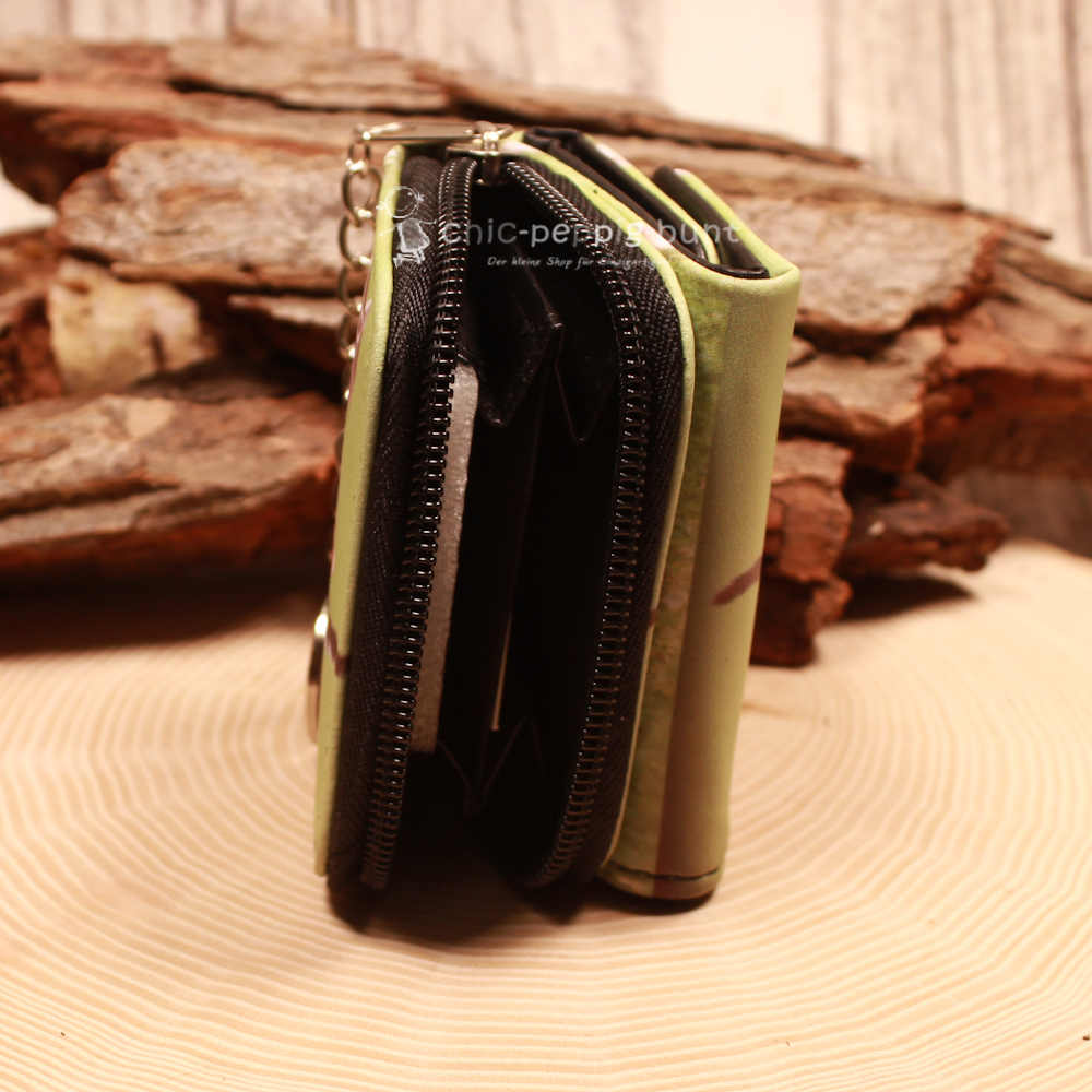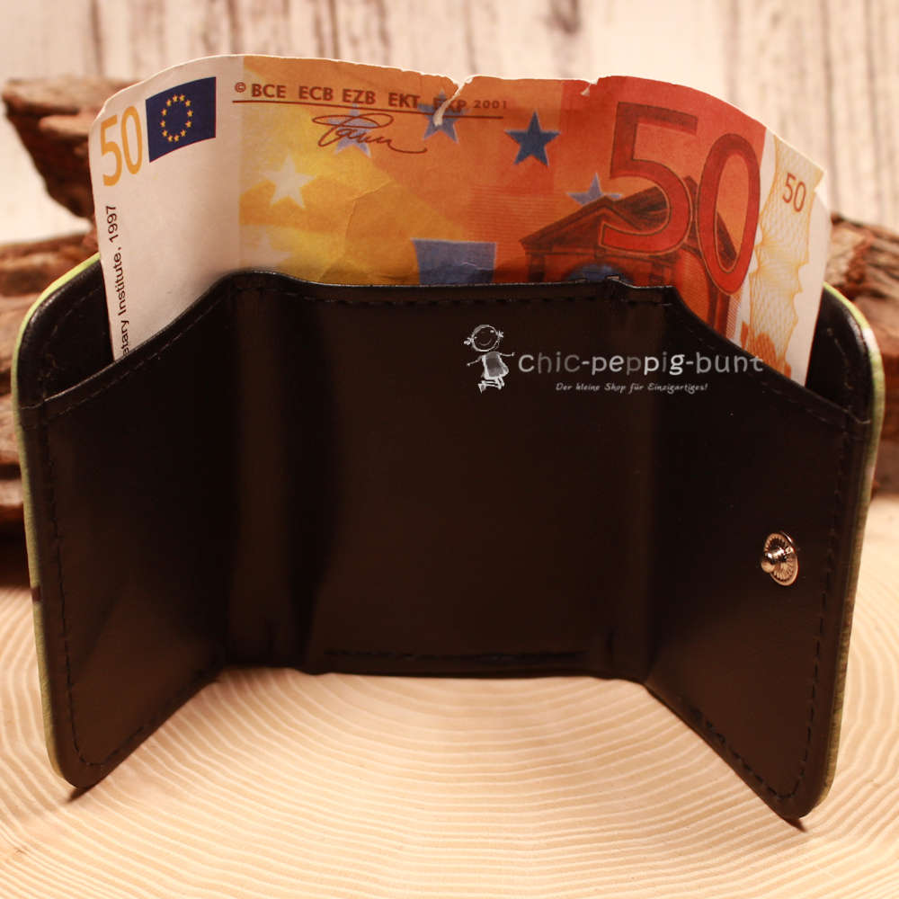 Da kleine Katzen (und Kinder!) gerne draußen unterwegs sind, besteht dieser Geldbeutel aus strapazierfähigem Kunstleder. Das Material hält einiges aus und lässt sich bei Verschmutzungen ganz leicht mit einem feuchten Tuch reinigen. Die Farbkombination in Grün-Bunt wirkt frisch und zeitlos.