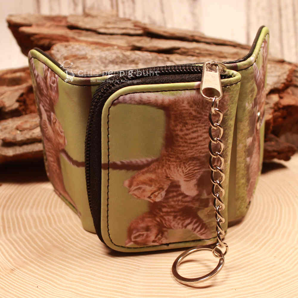 Katzen sind zwar eigenwillig, aber dieser Geldbeutel bleibt treu an deiner Seite. Wir haben eine 8 cm lange Gliederkette direkt am Gehäuse befestigt. Am Ende der Kette befindet sich ein stabiler Schlüsselring mit einem Durchmesser von 2,5 cm. Damit klickst du deinen neuen Schatz einfach an deinen Schlüsselbund, den Rucksack oder die Gürtelschlaufe deiner Jeans. So verhinderst du effektiv, dass das Portemonnaie bei wilden Abenteuern aus der Tasche hüpft.