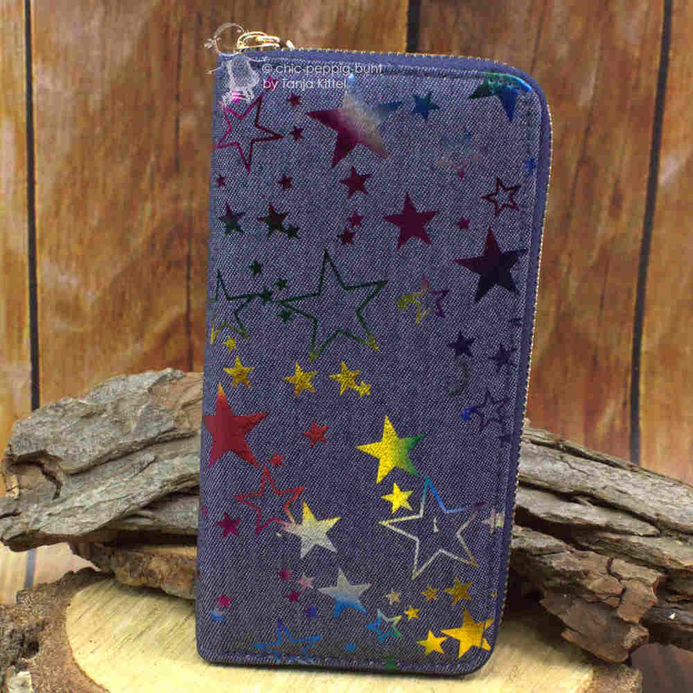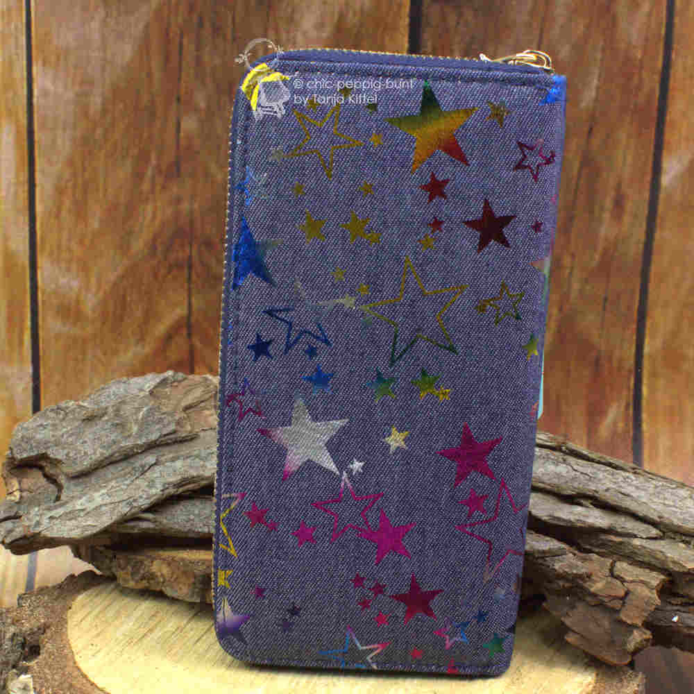 Geldbeutel gross - blau - Jeansoptik-Stoff - bunte Sterne - 14 Fächer