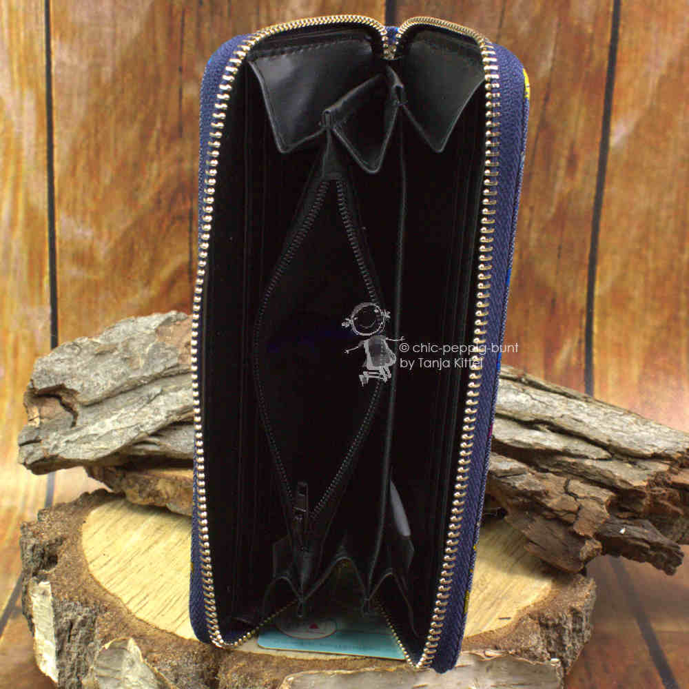 Dieser trendige grosse blaue Geldbeutel ist aus weichen Jeansoptik-Stoff gefertigt. Farbenfrohen bunt schimmernden Sterne sind ein ausergewöhnliches Motiv. Die 14 Fächer der Geldbörse bieten genügend Platz für Kleingeld, Geldscheine, EC-Karten, Führerschein und Ausweise. Die 8 Kartenfächer und die zwei grossen Fächer für Geldscheine werden mit einem Reißverschluss verschlossen. Zusätzlich hat der Geldbeutel ein Innenfach mit Reißverschluss das perfekt für Münzen und Kassenzettel geeignet ist. Die Größe des Geldbeutel beträgt ca. ca. 19 x 10 x 2 cm. Jetzt online bei chic-peppig-bunt.de bestellen!Hinweis: