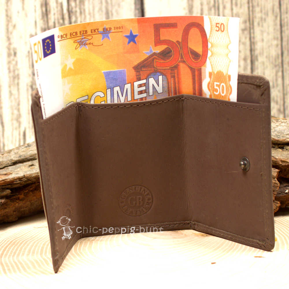 Fach 3 (Scheine): Ein weiteres Fach ist für gefaltete Geldscheine vorgesehen. Der gesamte Mini Geldbeutel wird mit einem weiteren Druckknopf sicher geschlossen.