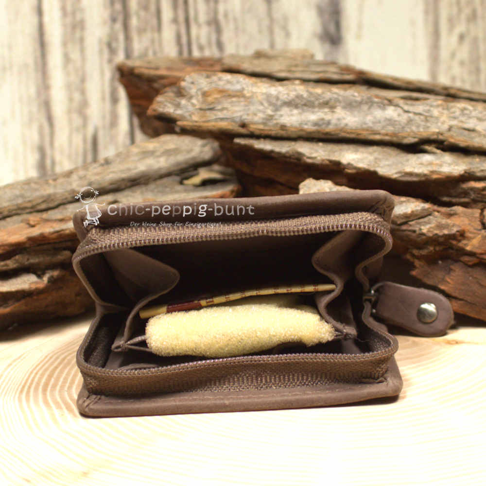 Innen zwei Kleingeldfächer: Im Inneren unterteilt eine Trennwand den Raum praktisch. Sie können Münzen sortieren (z. B. Euro- und Cent-Münzen trennen) oder das zweite Fach für gefaltete Scheine oder einen Schlüssel nutzen.