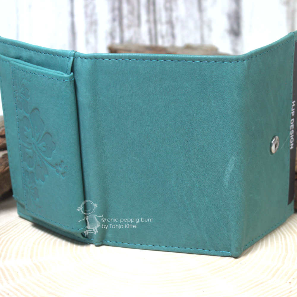 Das intensive türkis des Leders, kombiniert mit der eleganten Blumenprägung, macht dieses Portemonnaie zu einem echten Hingucker. Es ist ein modisches Statement, das deinen persönlichen Stil unterstreicht.