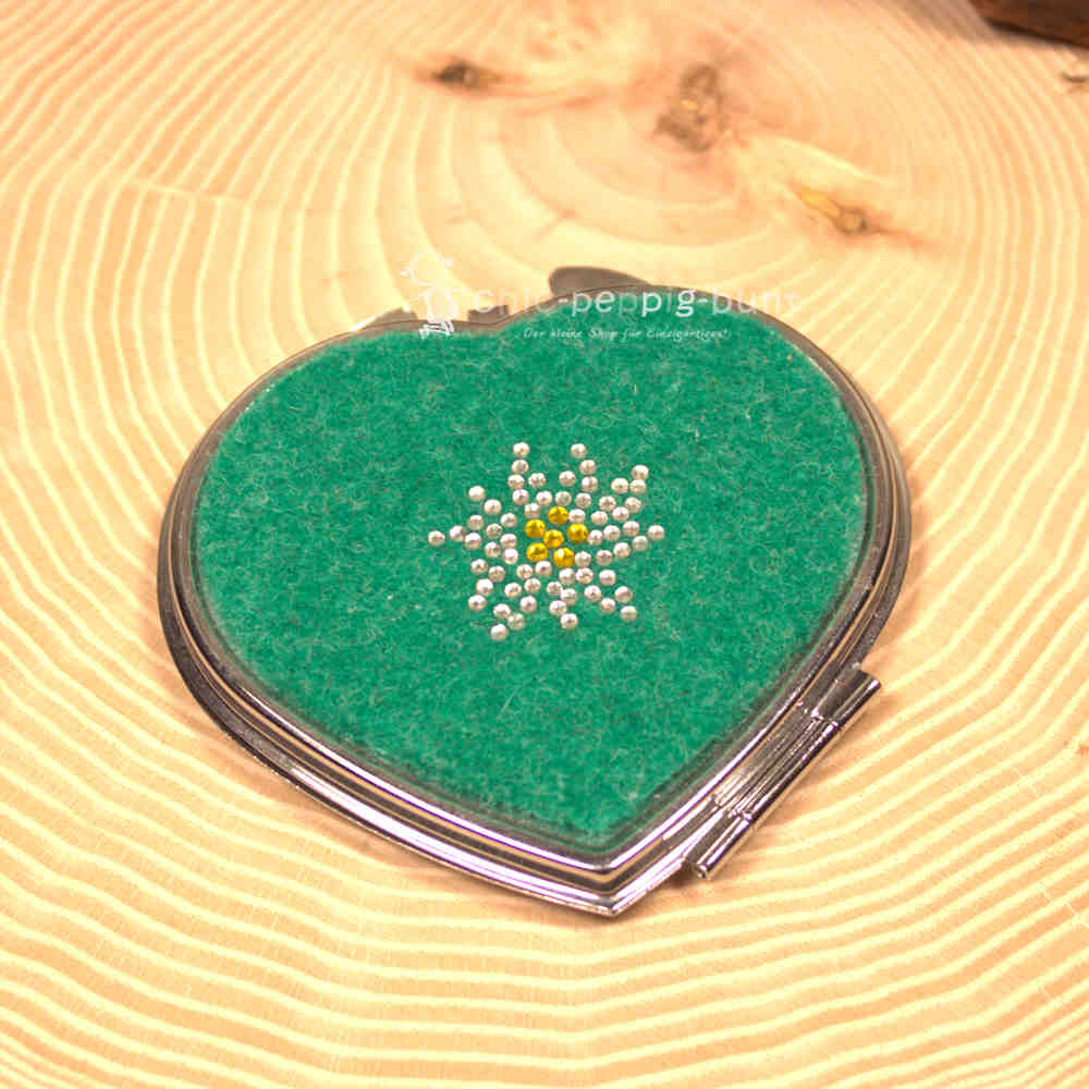Hand aufs Herz: Wer kennt das nicht? Ein schneller Blick muss sein! Mit unserem bezaubernden Handspiegel in Herzform fangen Sie diesen Moment stilvoll ein. Wir kombinieren traditionelle Materialien wie hochwertigen Filz mit einem modernen, funkelnden Design. Sie holen sich damit nicht nur einen praktischen Helfer, sondern auch ein echtes Trachtenaccessoire ins Haus.
