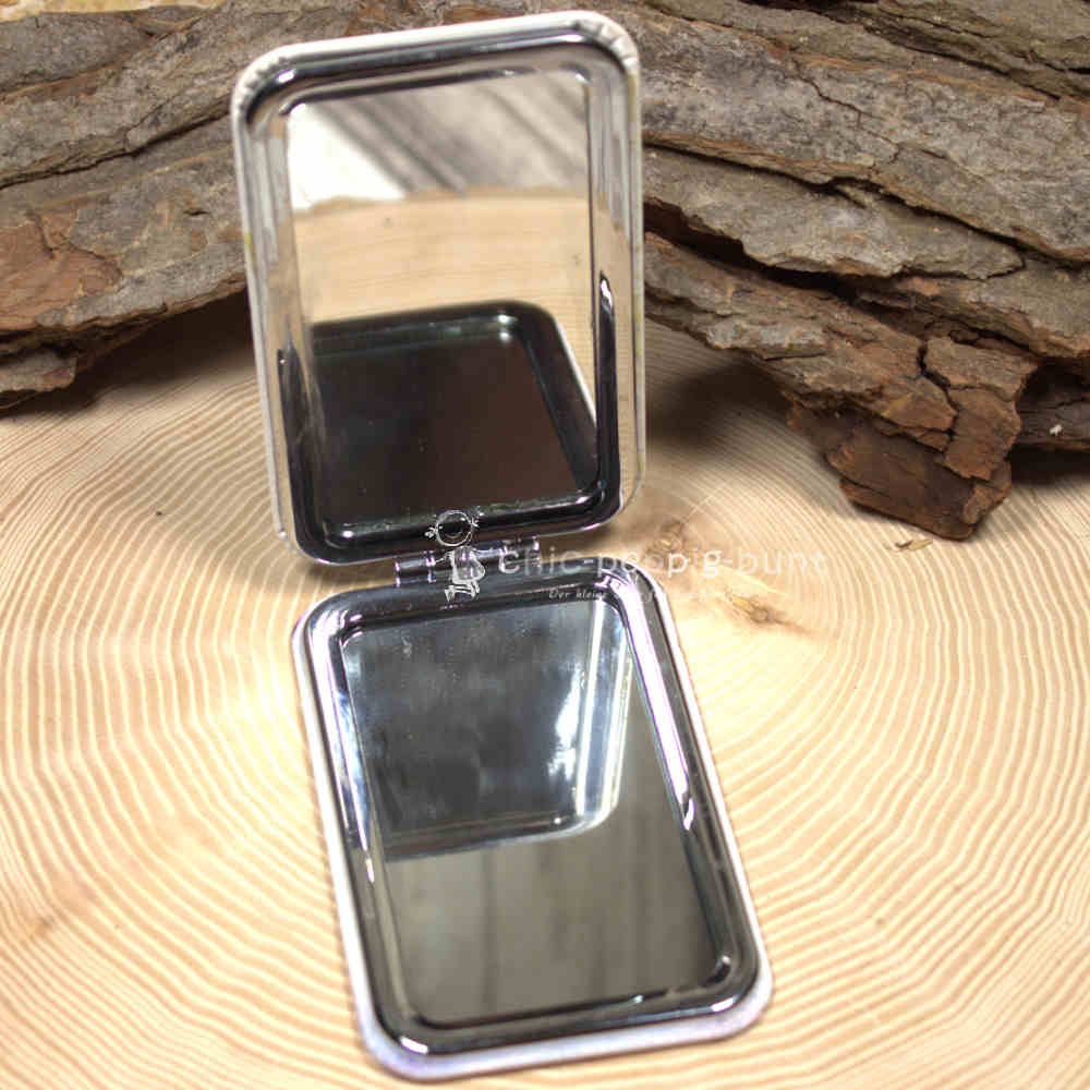 Wir haben unserem Taschenspiegel zwei Seiten spendiert, weil wir wissen, dass du beides brauchst. Du öffnest ihn ganz einfach – ein leichtes Aufklappen genügt – und entdeckst sofort zwei vollwertige Spiegel-Flächen.