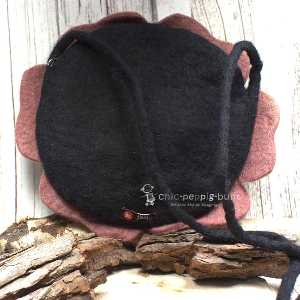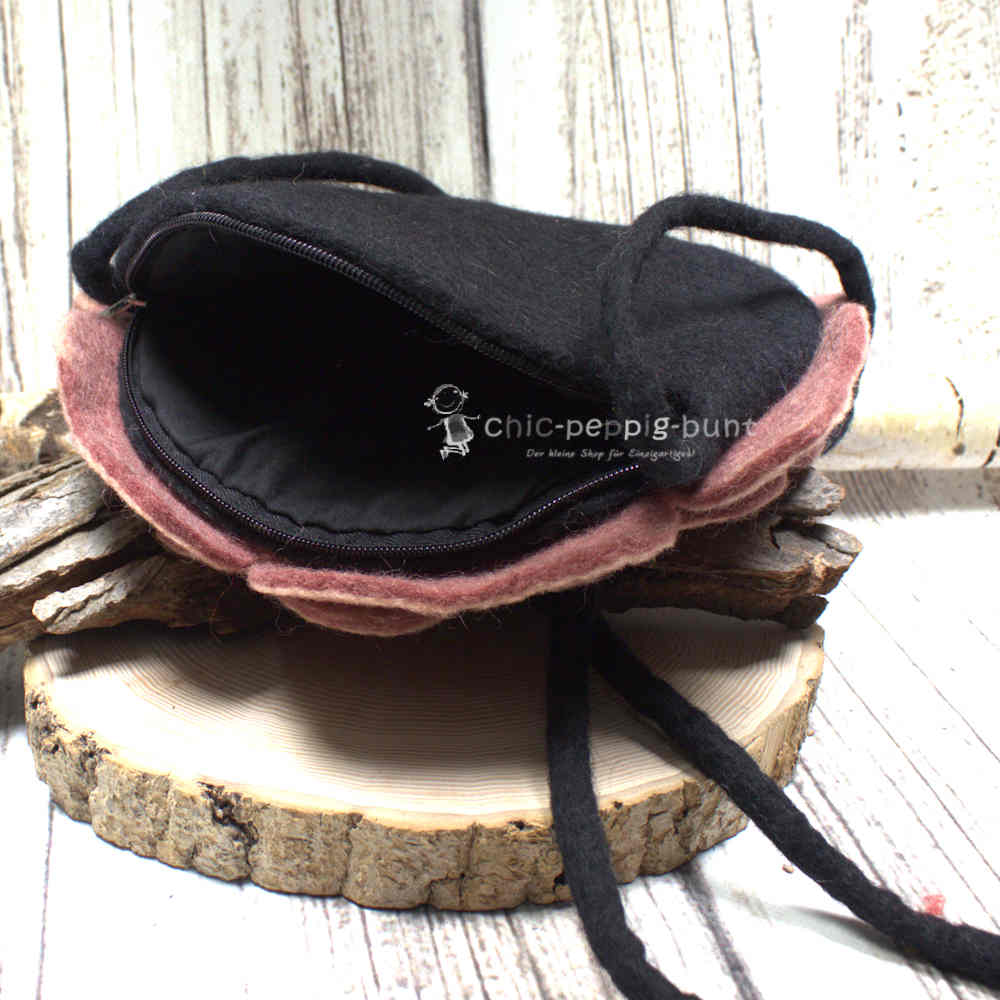 Eine gute Damentasche muss nicht nur verdammt gut aussehen, sondern auch deine Geheimnisse bewahren. Deshalb verstecken wir unter den altrosa Blütenblättern einen robusten Reißverschluss. Dieser schützt deine Wertsachen zuverlässig vor neugierigen Blicken oder flinken Fingern. Im Inneren erwartet dich ein elegantes schwarzes Innenfutter, das einen tollen Kontrast zum sanften Altrosa bildet. Mit einem stolzen Durchmesser von ca. 28 cm und einer Tiefe von 5 cm bietet das Hauptfach reichlich Platz für dein Smartphone, ein großes Portemonnaie und deinen Lieblingslippenstift. Wir verwenden für die gesamte Tasche 100 % Wolle, was den Filz besonders griffig und langlebig macht.