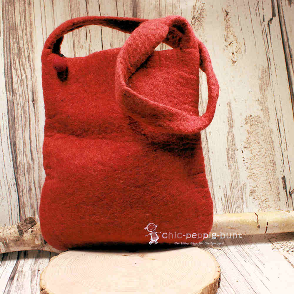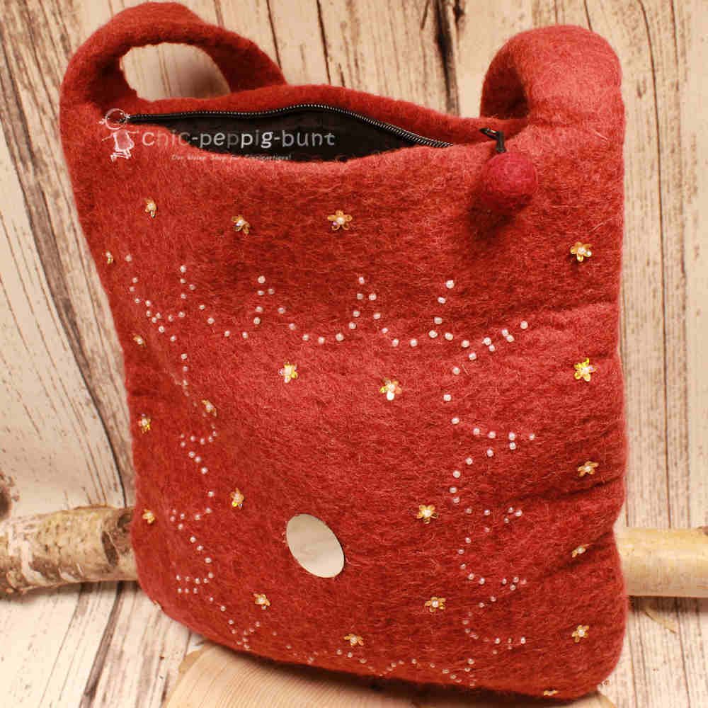 Bitte stecke deine Tasche niemals in die Waschmaschine. Der Filz könnte dort so stark einlaufen, dass am Ende nur noch eine Kindertasche für ein Meerschweinchen übrig bleibt. Auch der Trockner ist tabu – es sei denn, du stehst auf den "Knitter-Look des Grauens".