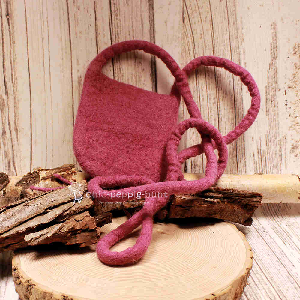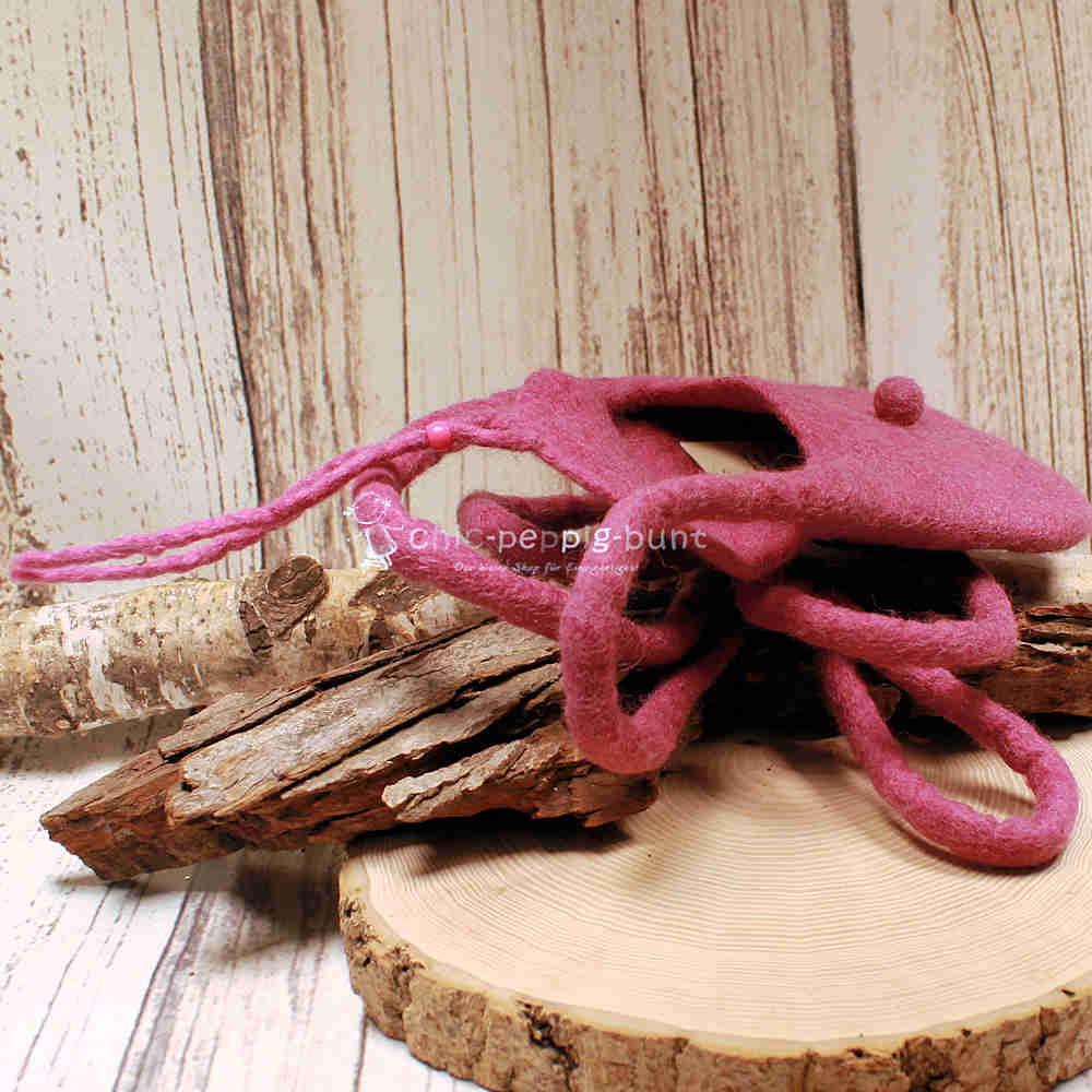 | Verschluss | Filzknopf mit zwei Filzbändern und Perle |