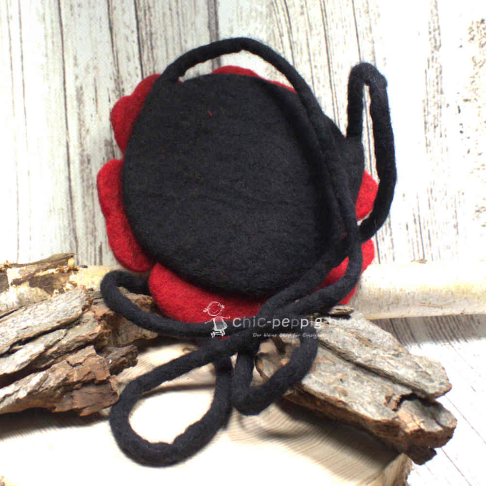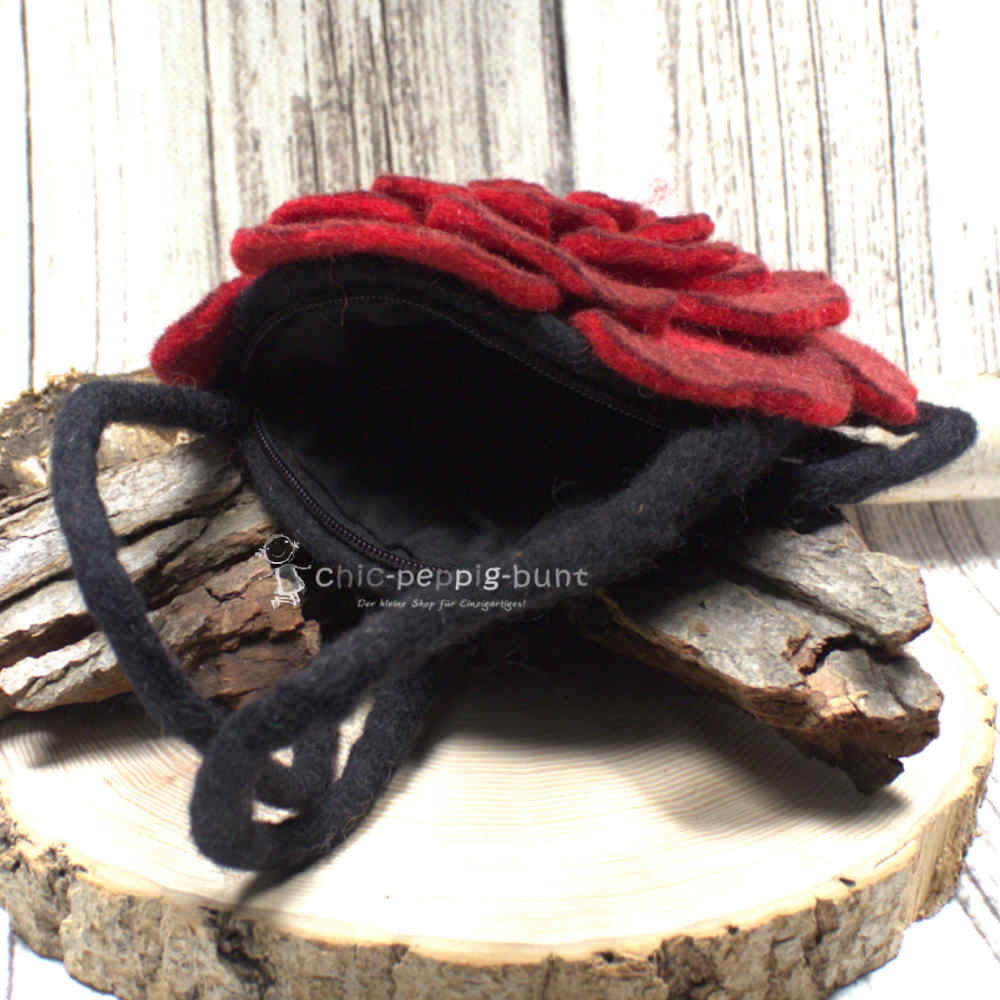 Eine gute Damentasche muss nicht nur verdammt gut aussehen, sondern auch deine Geheimnisse bewahren. Deshalb verstecken wir unter den roten Blütenblättern einen robusten Reißverschluss. Dieser schützt deine Wertsachen zuverlässig vor neugierigen Blicken oder flinken Fingern. Im Inneren erwartet dich ein elegantes schwarzes Innenfutter, das einen tollen Kontrast zum feurigen Rot bildet. Mit einem Durchmesser von ca. 21 cm und einer Tiefe von 5 cm bietet das Hauptfach überraschend viel Platz für dein Smartphone, dein Portemonnaie und deinen Lieblingslippenstift. Wir verwenden für die gesamte Tasche 100 % Wolle, was den Filz besonders griffig und langlebig macht.