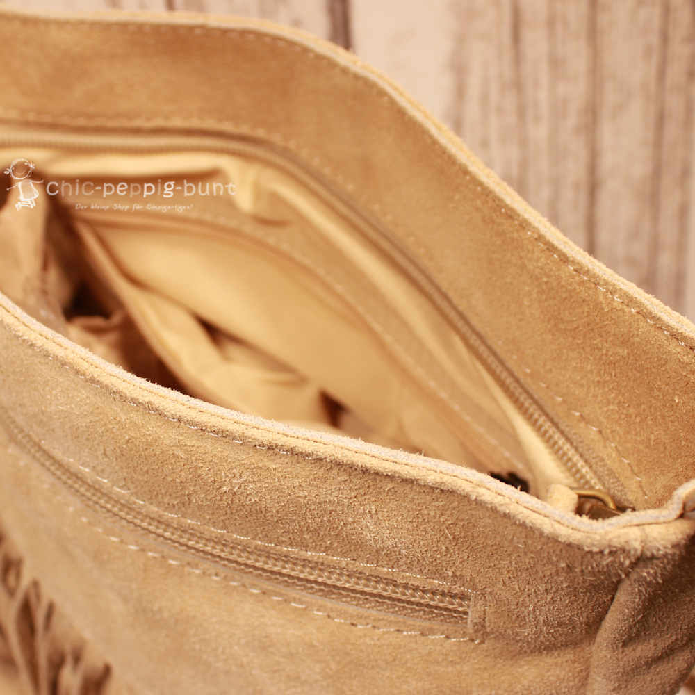 Bist du bereit für ein Accessoire, das deinem Outfit sofort Charakter verleiht? Unsere beige Handtasche aus echtem Wildleder ist weit mehr als nur ein praktischer Aufbewahrungsort. Wir haben hier Design und Funktionalität so kombiniert, dass du dich jeden Tag neu in deine Tasche verliebst. Das weiche Wildleder fühlt sich fantastisch an und die langen Fransen sorgen für eine Extraportion Dynamik bei jedem deiner Schritte. Warum solltest du dich mit weniger zufrieden geben, wenn du das perfekte Festival-Feeling auch im Büro tragen kannst?