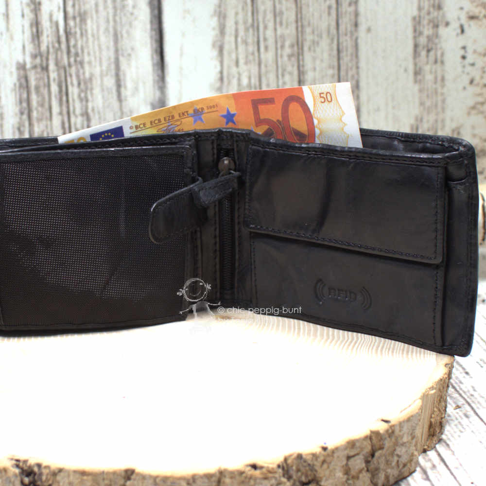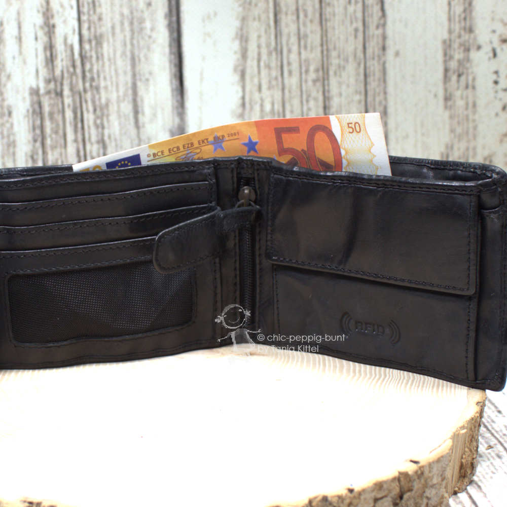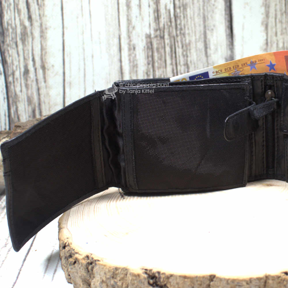 1 Kleingeldfach: Das Münzfach schließen wir mit einem stabilen Knopf. Dieses Fach hält Ihr Kleingeld sicher und jederzeit griffbereit.