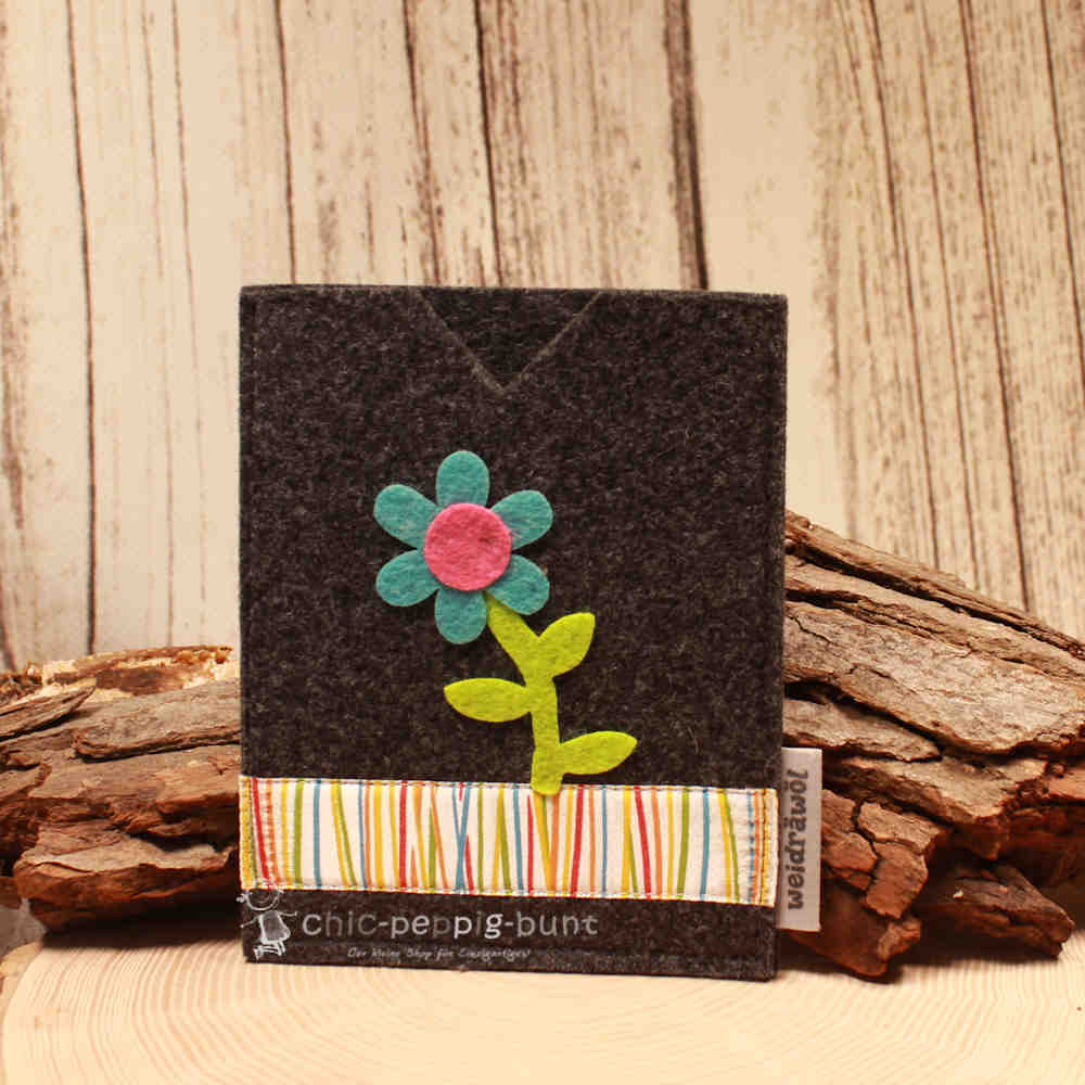 Wir lieben Materialien, die sich gut anfühlen und gleichzeitig jedes Abenteuer mitmachen. Die Außenseite besticht durch robusten, dunkelgrauen Filz, der deinen Reisepass wie ein schützendes Nest umschließt. Als optisches Highlight leuchtet eine wunderschöne blaue Blume auf der Vorderseite. Eine bunt gestreifte Bordüre rahmt das Design perfekt ein und setzt einen lebendigen Kontrast zum edlen Grau.
