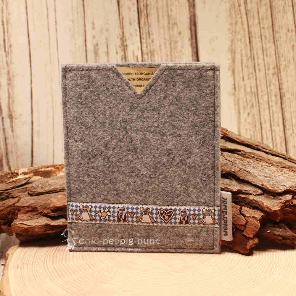 Wir lieben Materialien, die sich gut anfühlen und eine Geschichte erzählen! Die Außenseite besticht durch robusten, hellgrauen Filz, der deinen Reisepass wie ein schützendes Nest umschließt. Als optisches Highlight dient eine klassische blau-weiße Bordüre mit einem herzlichen Trachtenmotiv. Dieses Design macht deine neue Ausweishülle zum Star in jedem Koffer – von München bis nach Übersee.