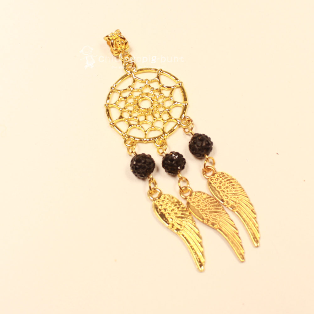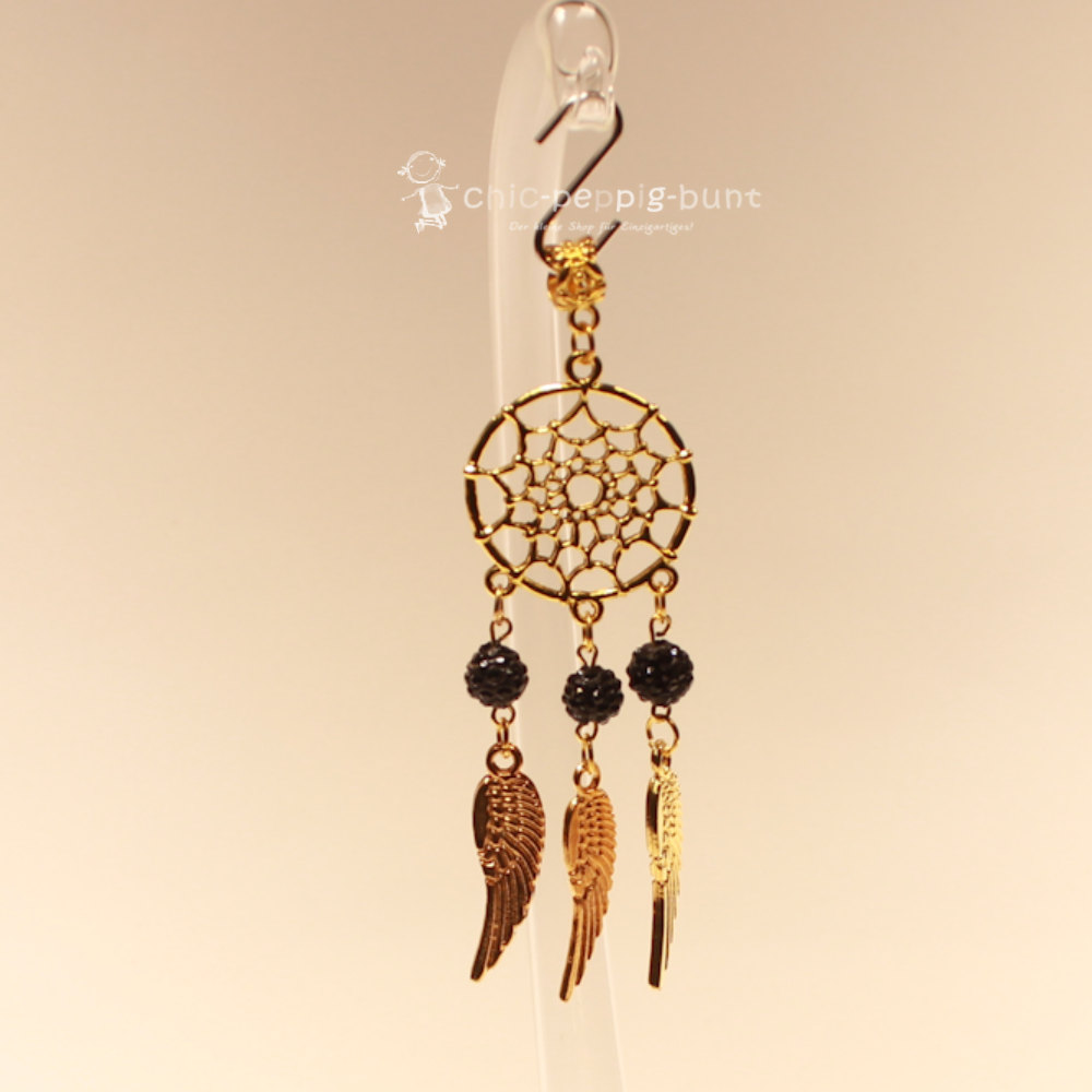 Unter dem goldenen Geflecht hängen drei detailreiche Flügel, die bei jeder deiner Bewegungen sanft mitschwingen. Sie verleihen dem Design eine himmlische Leichtigkeit. Als absoluter Clou dienen drei große, tiefschwarze Strass-Perlen. Diese Perlen sind mit unzähligen kleinen Kristallen besetzt, die das Licht einfangen und in mystischen Funken wieder abgeben. Schwarz und Gold ist eben eine Kombination, die niemals aus der Mode kommt – genau wie Kaffee und Kuchen, nur eben ohne Kalorien.