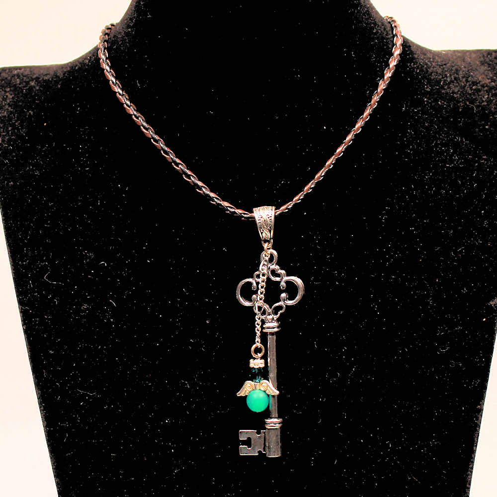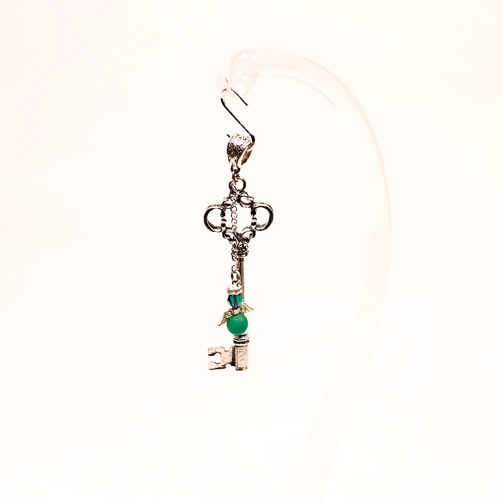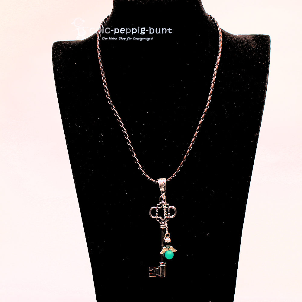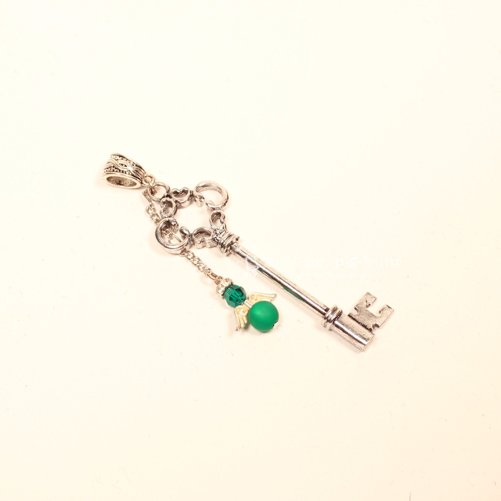 Das Herzstück dieses Schmuckstücks ist der detailreiche, versilberte Schlüssel. Er wirkt wie ein Fundstück aus einer geheimnisvollen Schatztruhe. Direkt am Griff thront dein persönlicher Schutzengel. Wir fertigen den Körper des Engels aus einer hochwertigen, grünen Polarisperle. Polarisperlen besitzen die wunderbare Eigenschaft, dass sie bei Hautkontakt ihren Glanz vertiefen und fast von innen heraus zu leuchten scheinen.