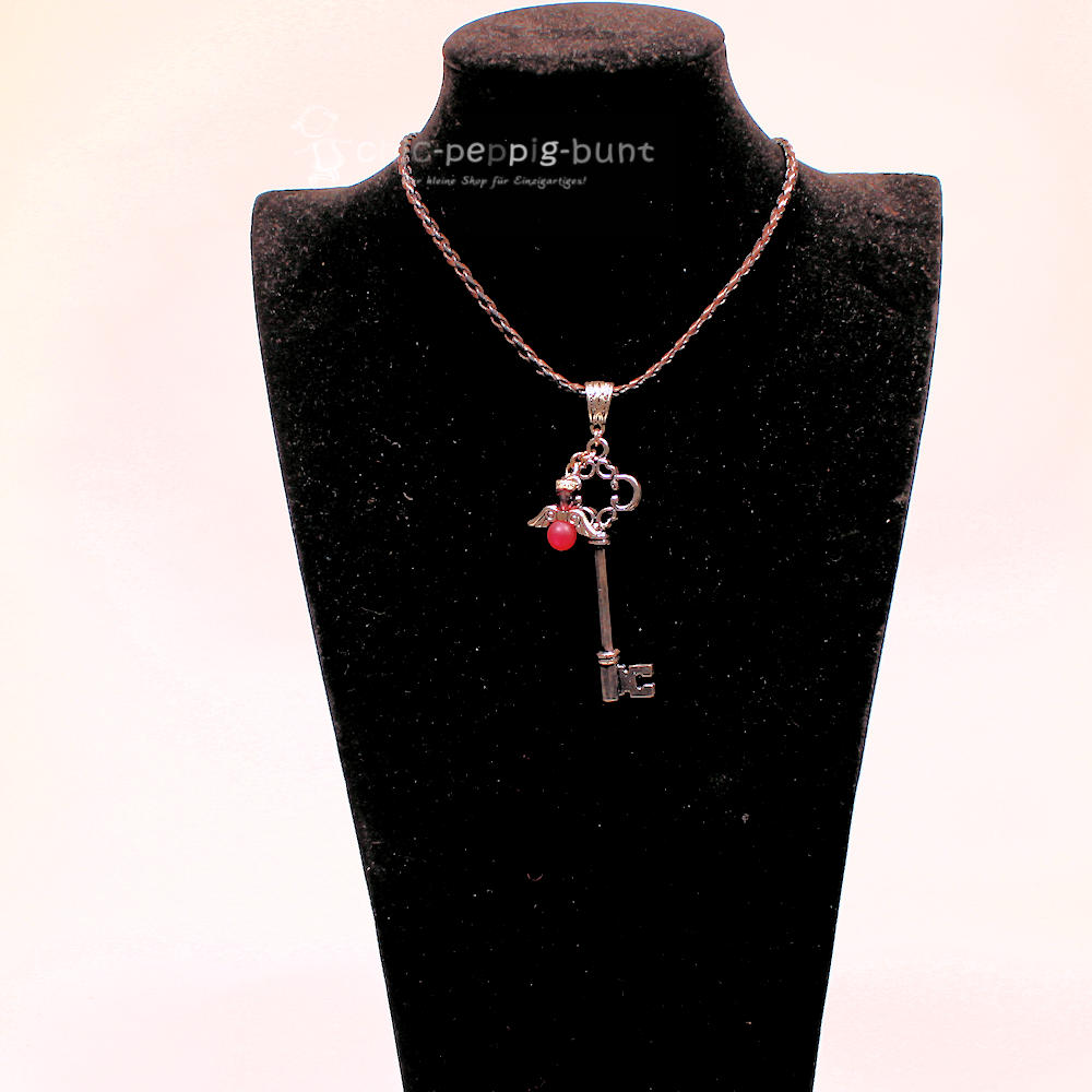 Das Herzstück dieses Schmuckstücks bildet der detailreiche, versilberte Schlüssel. Er wirkt wie ein kostbares Erbstück aus einer geheimnisvollen Schatztruhe. Direkt am Griff thront dein persönlicher Schutzengel. Wir fertigen den Körper des Engels aus einer hochwertigen, pinken Polarisperle. Diese Perlen besitzen die magische Eigenschaft, dass sie bei Hautkontakt ihren Glanz vertiefen und fast von innen heraus zu leuchten scheinen.