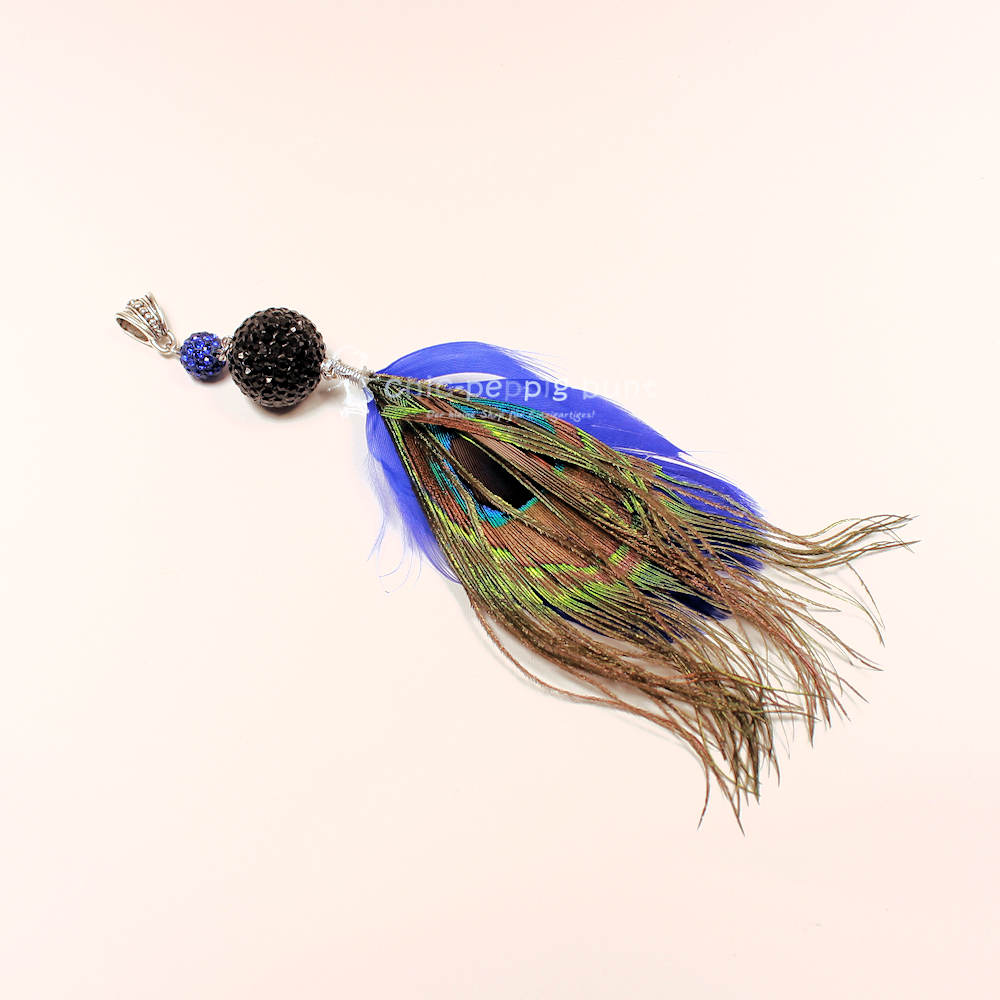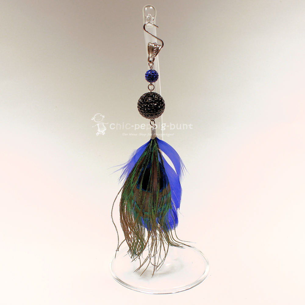 Der blaue Akzent: Eine kleine, blaue Strass-Perle spiegelt das Leuchten der Feder wider und rundet das Gesamtbild farblich perfekt ab.