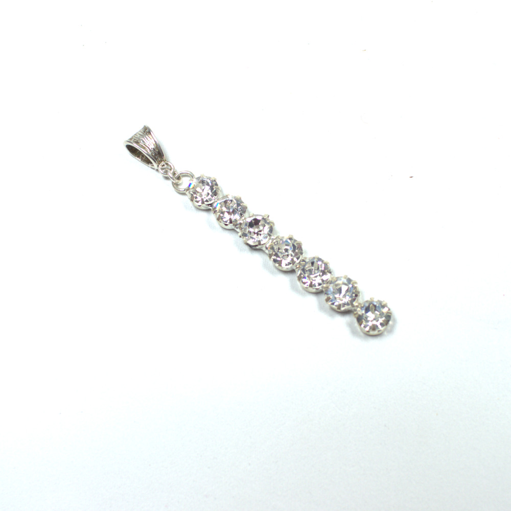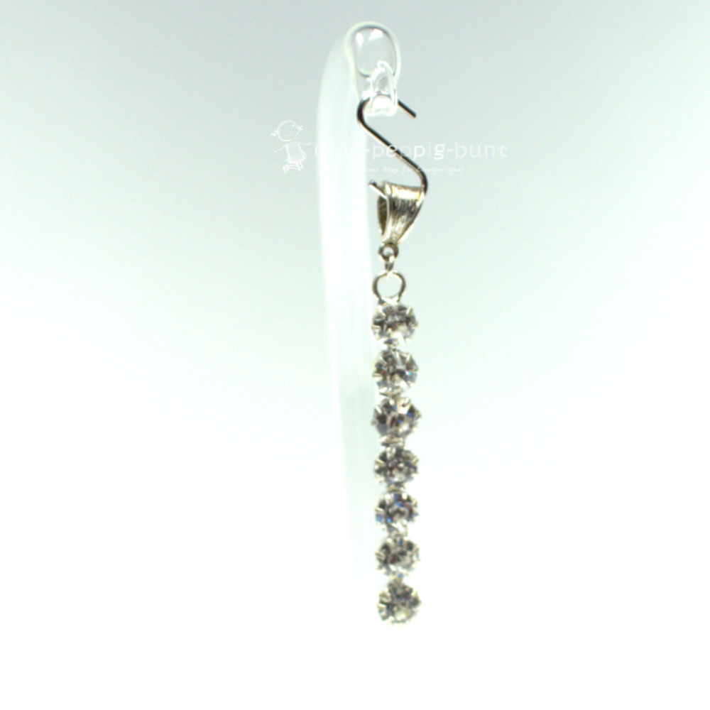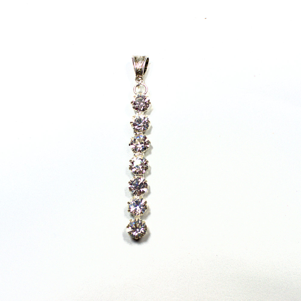 Warum sich mit einem Stein zufriedenstellen, wenn man gleich sieben haben kann? Bei diesem Schmuckanhänger reihen sich sieben große, glasklare Strass-Steine wie an einer Schnur auf. Jeder einzelne Stein sitzt fest in einer versilberten Fassung, die den Glanz der Kristalle zusätzlich unterstreicht.