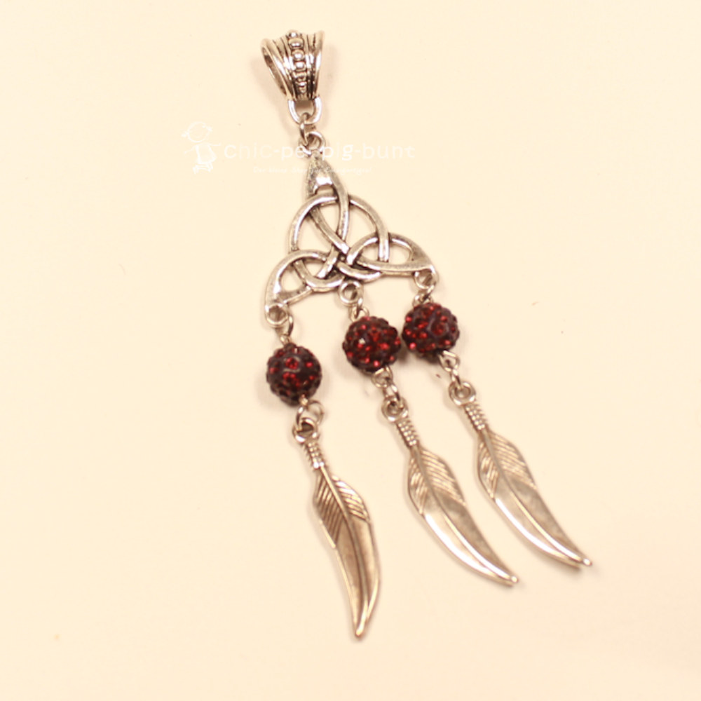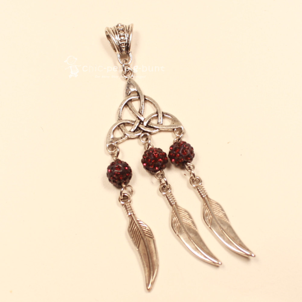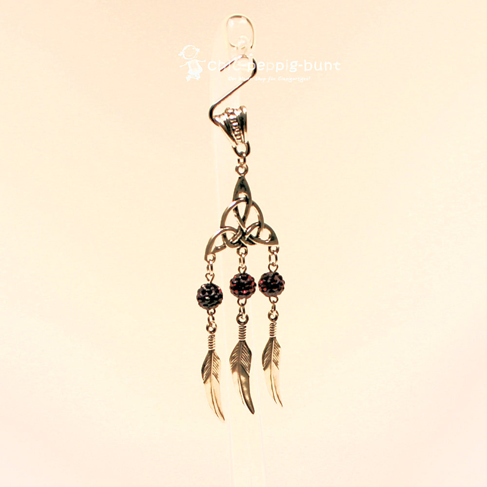 Das Oberteil dieses Schmuckstücks besteht aus einem kunstvoll gestalteten Metallelement. Die verschlungenen Bögen erinnern an klassische keltische Knotenmuster und verleihen dem Schmuckanhänger eine tiefe, fast magische Bedeutung. Das eigentliche Highlight baumelt jedoch direkt darunter: Drei filigrane Federn, ebenfalls aus Metall gefertigt, schwingen bei jeder deiner Bewegungen sanft mit.