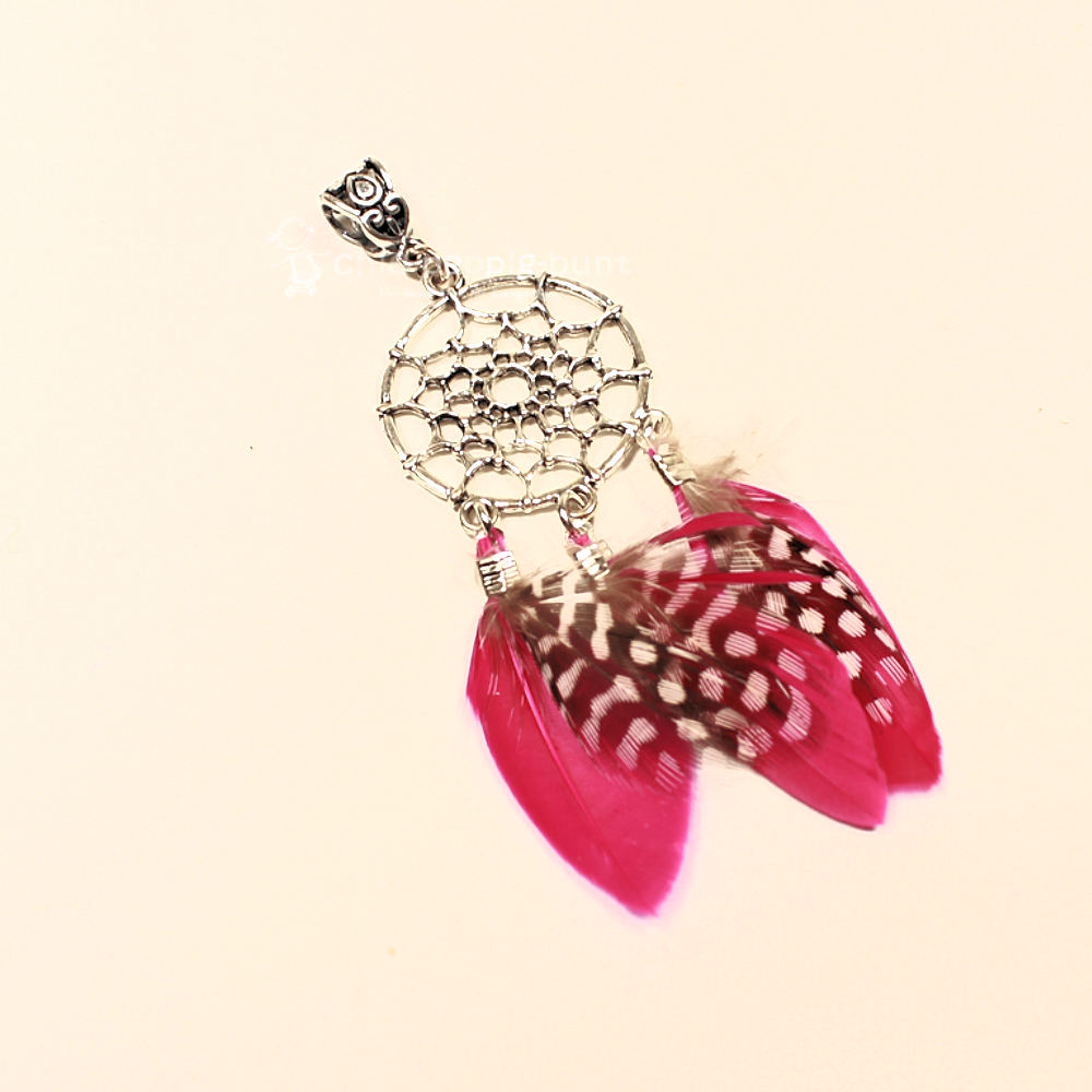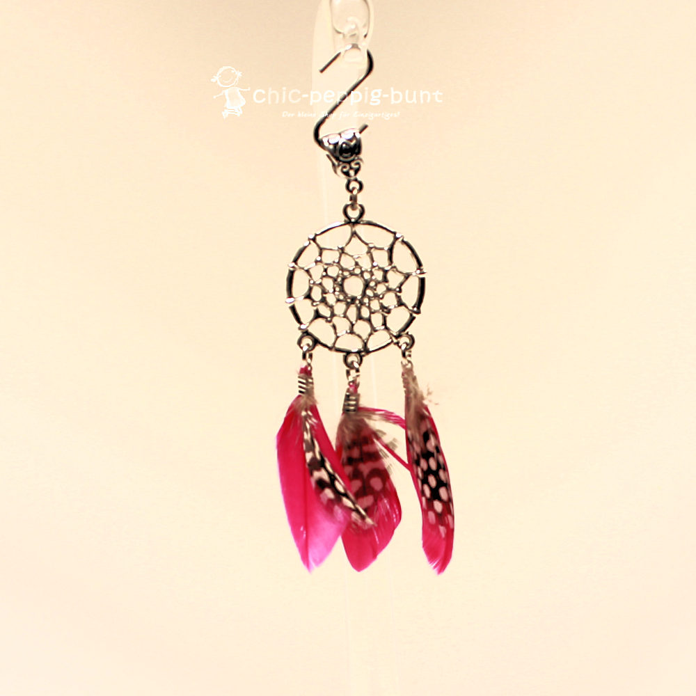 Das Fundament dieses Schmuckstücks bildet ein kunstvoll gearbeitetes, versilbertes Metallelement. Die verschlungenen Bögen im keltischen Stil geben dem Schmuckanhänger eine zeitlose und stabile Struktur. Doch das eigentliche Feuerwerk findet weiter unten statt: Drei echte, leuchtend pinke Federn baumeln am Element und schwingen bei jedem deiner Schritte fröhlich mit.