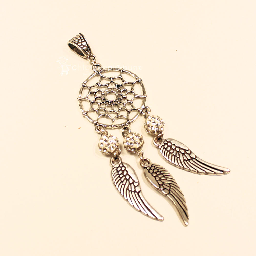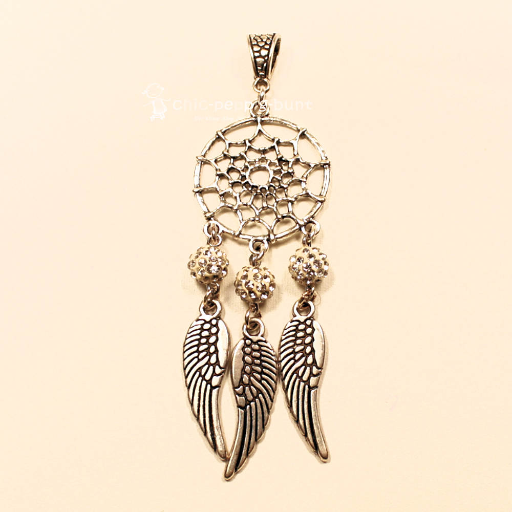 Das Herzstück dieses Schmuckstücks bildet ein klassisch runder Traumfänger aus hochwertigem Metall. Die feine Netzstruktur innerhalb des Rings verleiht dem Schmuckanhänger eine luftige Leichtigkeit. Doch das wahre Highlight sitzt direkt in der Mitte: Eine große, weiße Strass-Perle in Crystal-Optik thront dort wie ein kleiner Stern. Die unzähligen Kristalle fangen jeden Sonnenstrahl ein und werfen ihn in einem funkelnden Feuerwerk zurück.