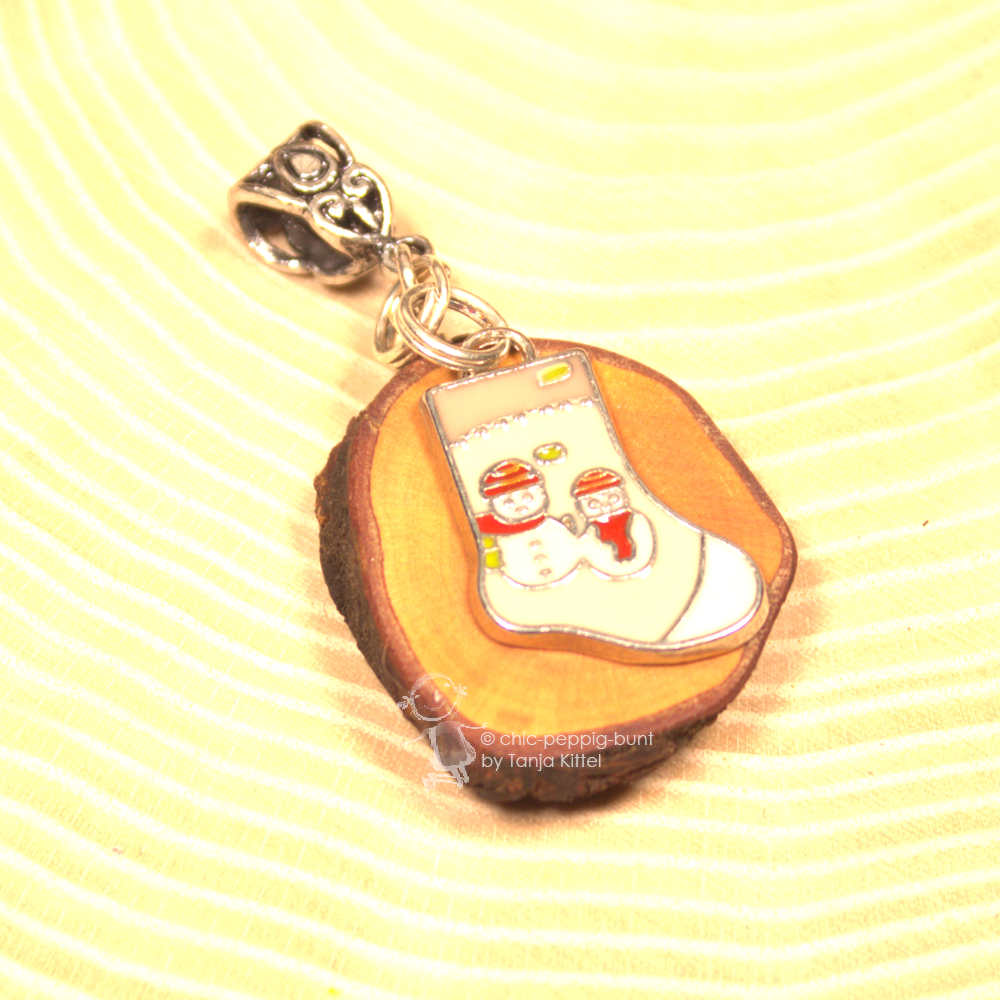 Trotz der rustikalen Holzscheibe bleibt der Kettenanhänger dank seiner flachen Masse angenehm zu tragen. Die Proportionen wurden so gewählt, dass die Holzscheibe und der Nikolausstrumpf harmonisch miteinander wirken.