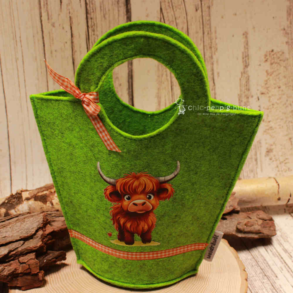 Wer braucht schon eine echte Kuh im Garten, wenn man dieses süße Rindchen immer dabeihaben kann? Unsere grüne Kindertasche aus bestem Filz erinnert an saftige Wiesen und bringt Kinderaugen sofort zum Leuchten. Das Besondere an diesem Modell: Wir drucken das Motiv nicht einfach lieblos auf die Oberfläche! Das drollige Mini-Rind pressen unsere Experten mit hohem Druck direkt auf den Filz. Dadurch entsteht eine edle, haptische Struktur, die kleine Entdecker sogar mit den Fingerspitzen erfühlen können. Eine feine, kleine Schleife ziert die Tasche zusätzlich und verleiht ihr einen besonders verspielten Look. Diese Tasche sieht also nicht nur fantastisch aus, sondern sie fühlt sich auch verdammt hochwertig an.