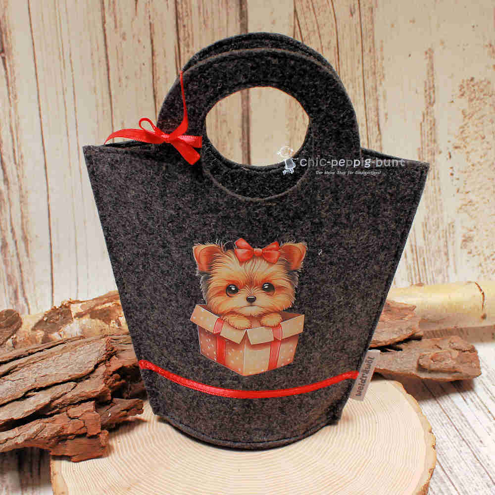 Wer braucht schon ein echtes Haustier, wenn man diesen charmanten Kameraden immer dabeihaben kann? Unsere schwarze Kindertasche aus bestem Filz bringt Kinderaugen sofort zum Leuchten. Das Besondere an diesem Modell: Wir drucken das Motiv nicht einfach billig auf die Oberfläche! Das drollige Hundemotiv pressen unsere Experten mit hohem Druck direkt auf den Filz. Dadurch entsteht eine edle, haptische Struktur, die kleine Entdecker sogar mit den Fingern erfühlen können. Eine feine, kleine Schleife ziert die Tasche zusätzlich und verleiht ihr einen besonders verspielten Look. Diese Tasche sieht also nicht nur fantastisch aus, sondern sie fühlt sich auch verdammt hochwertig an.