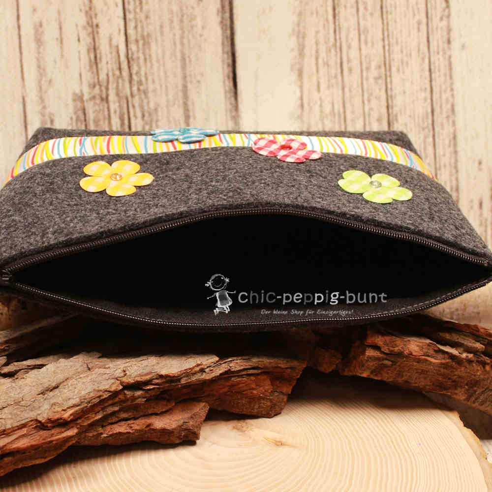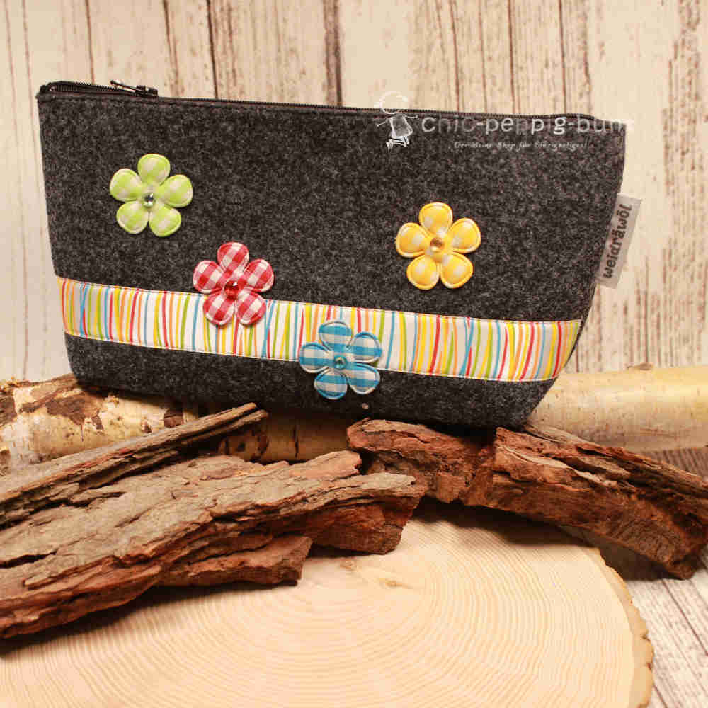 Stilvolles Design trifft auf echte HandarbeitSuchst du nach einem Begleiter, der nicht nur praktisch ist, sondern auch eine Geschichte erzählt? Dann ist diese Kosmetiktasche genau dein Ding! Wir nähen jede Tasche von Hand aus hochwertigem, dunkelgrauem Filz. Dieser Stoff sieht nicht nur edel aus, sondern schützt den Inhalt auch sanft vor Stößen. Um dem schlichten Grau ein wenig Leben einzuhauchen, haben wir die Vorderseite mit einem schicken, gestreiften Stoffband aufgepeppt. Das absolute Highlight bilden jedoch die vier aufgenähten Blumen in verschiedenen Farben. Sie machen jede Utensilientasche zu einem echten Gute-Laune-Garanten, egal wie früh es am Morgen im Badezimmer auch sein mag.