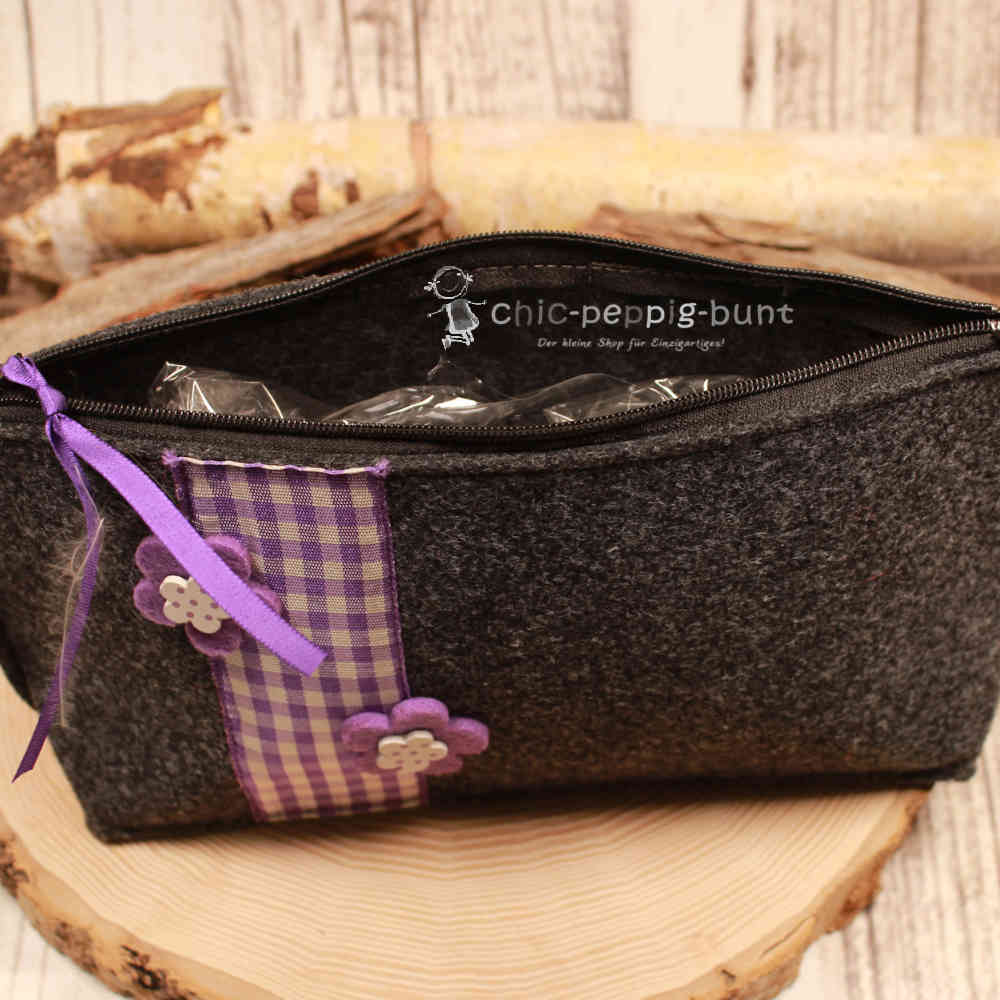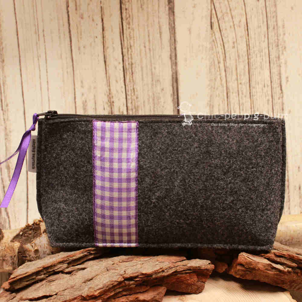 Bist du bereit für eine Tasche, die genauso individuell ist wie du? Dann haben wir hier ein echtes Schmuckstück für dich! Wir fertigen diese Kosmetiktasche aus hochwertigem, dunkelgrauem Filz, der nicht nur edel aussieht, sondern sich auch wunderbar weich anfühlt. Damit das Ganze nicht zu ernst wirkt, peppen wir das Design ordentlich auf. Ein freches Stoffband mit lila Karomuster zieht sich über die Vorderseite. Das Highlight bilden jedoch die zwei aufgenähten Blumen in sattem Lila. Diese floralen Begleiter sorgen selbst an einem verregneten Montagmorgen für gute Laune im Badezimmer.