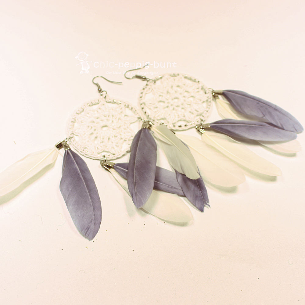 Suchst du nach Schmuck, der deine Persönlichkeit unterstreicht? Wir präsentieren dir Ohrringe, die weit weg von langweiliger Massenware entstehen! In unserer Kreativwerkstatt fertigen wir unter dem Label chic-peppig-bunt jedes Paar in liebevoller Handarbeit an. Diese versilberten Hänger sind kleine Kunstwerke, die wir mit viel Geduld für dich gestalten. Wir häkeln das kreisrunde Traumfänger-Motiv präzise von Hand und kombinieren es mit hochwertigen Metall-Elementen im edlen Silber-Look. Die Federn in Weiß und Grau verleihen dem Modeschmuck eine sanfte Eleganz, die dich perfekt durch den Sommer oder die nächste Partynacht begleitet.