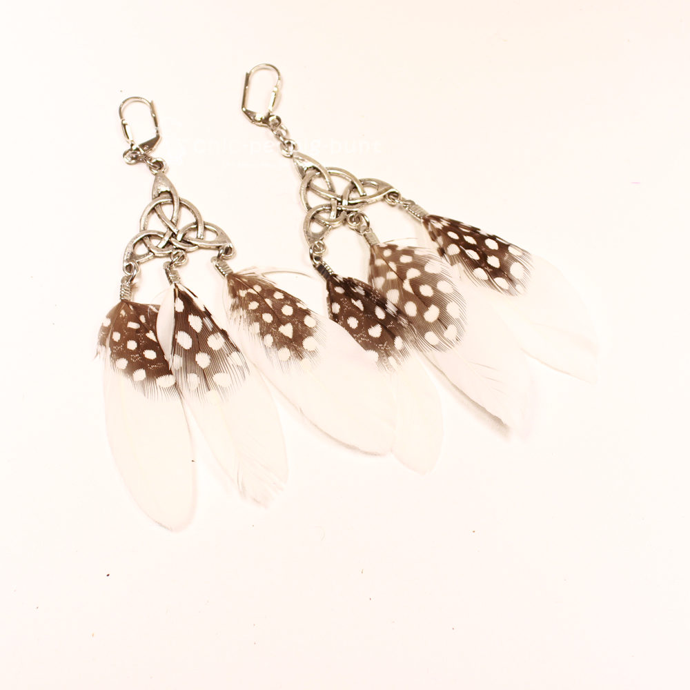Suchst du nach einem Accessoire, das deine verspielte Seite unterstreicht? Wir präsentieren dir Ohrringe, die garantiert für Gesprächsstoff sorgen! In unserer Kreativwerkstatt fertigen wir unter dem Label chic-peppig-bunt jedes Paar in liebevoller Handarbeit an. Diese versilberten Hänger sind kleine Kunstwerke, die wir mit viel Geduld und Leidenschaft für dich gestalten. Wir kombinieren das klassische, runde Traumfänger-Motiv aus Metall mit schneeweißen Federn, die das charmante Muster eines Polka-Dot-Vogels tragen. Diese kleinen weißen Punkte auf den Federn verleihen dem Schmuckstück einen authentischen Hippie-Look. Dieser Style begleitet dich perfekt durch die nächste laue Sommernacht am Strand oder veredelt dein Kostüm für die kommende Faschingssaison.