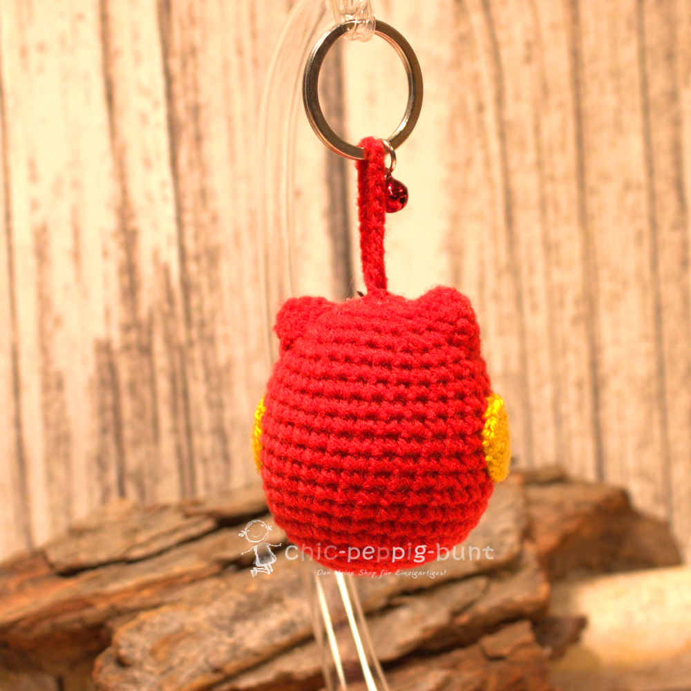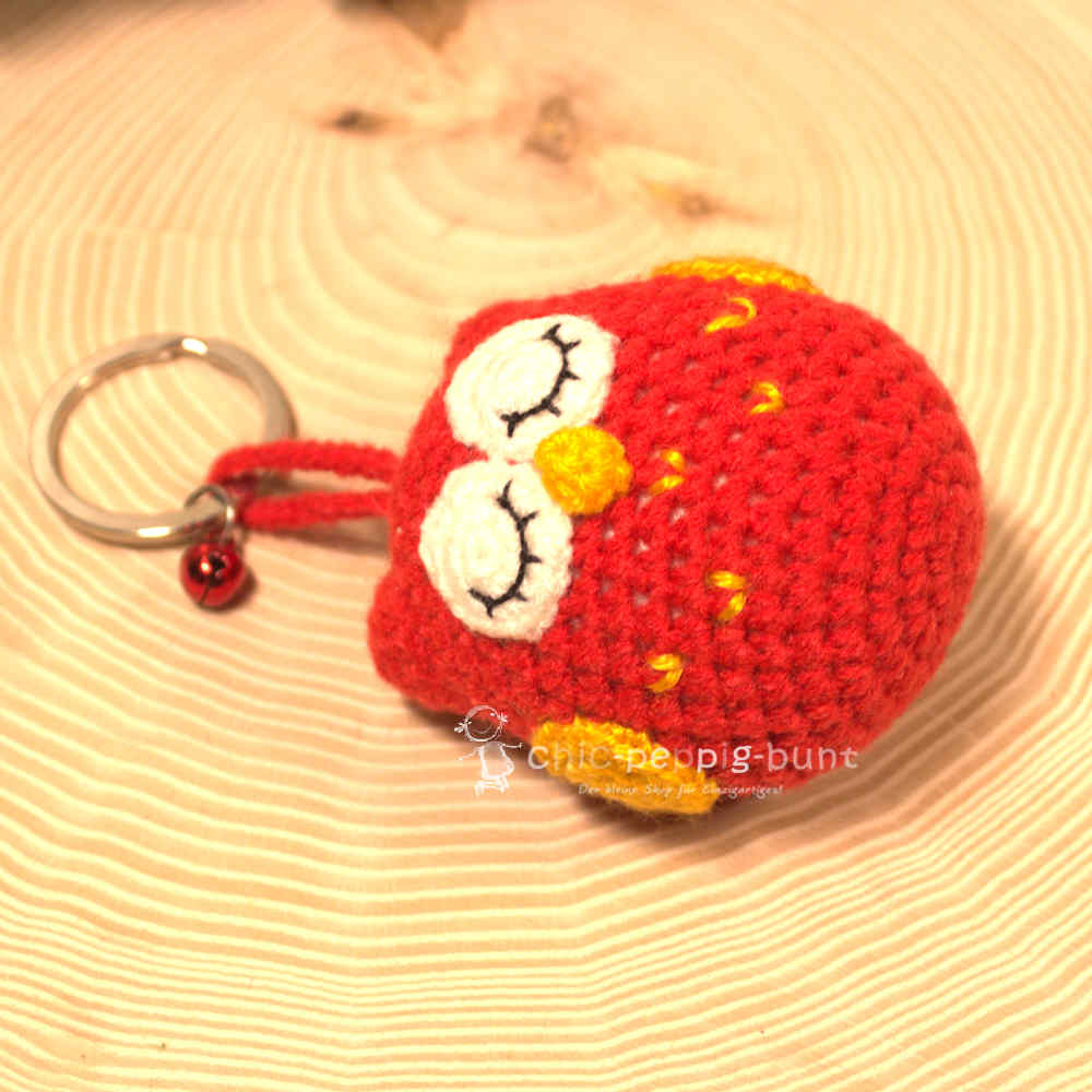 Einteilung des Schlüsselanhängers: Die Hauptbestandteile umfassen den dicht gehäkelten Wollkörper, aufwändig gearbeitete Augenpartien, den sicheren Metallring für den Schlüsselbund und die integrierte Schelle an der Unterseite. Wir liefern Ihnen also ein komplettes, sofort einsatzbereites Produkt.