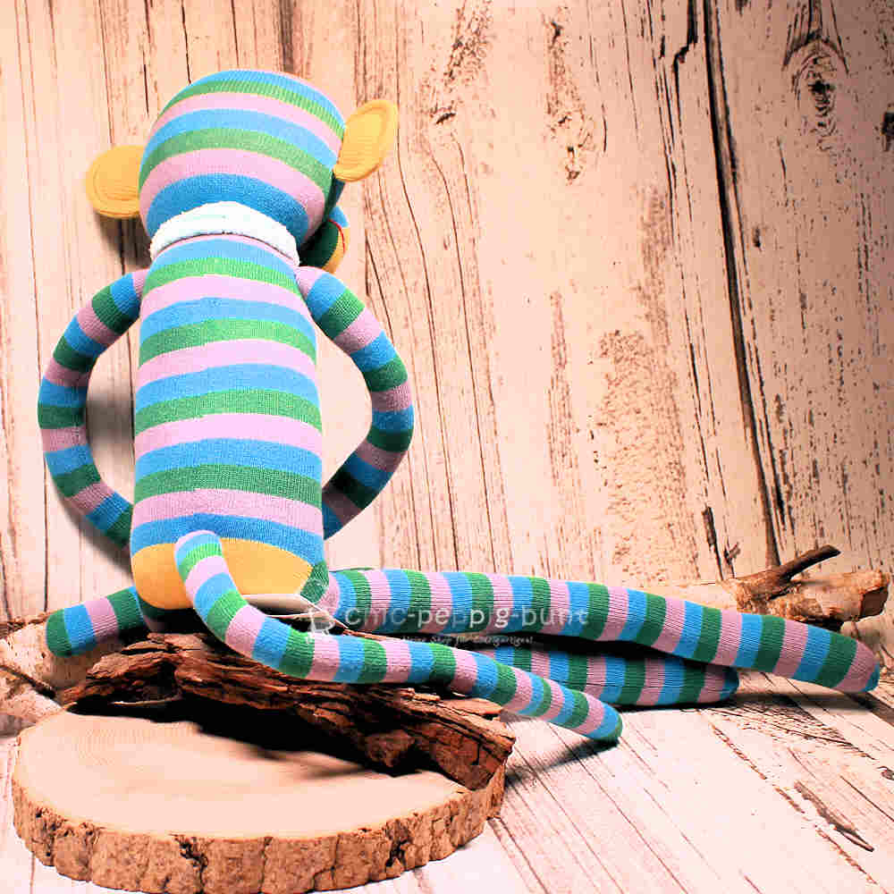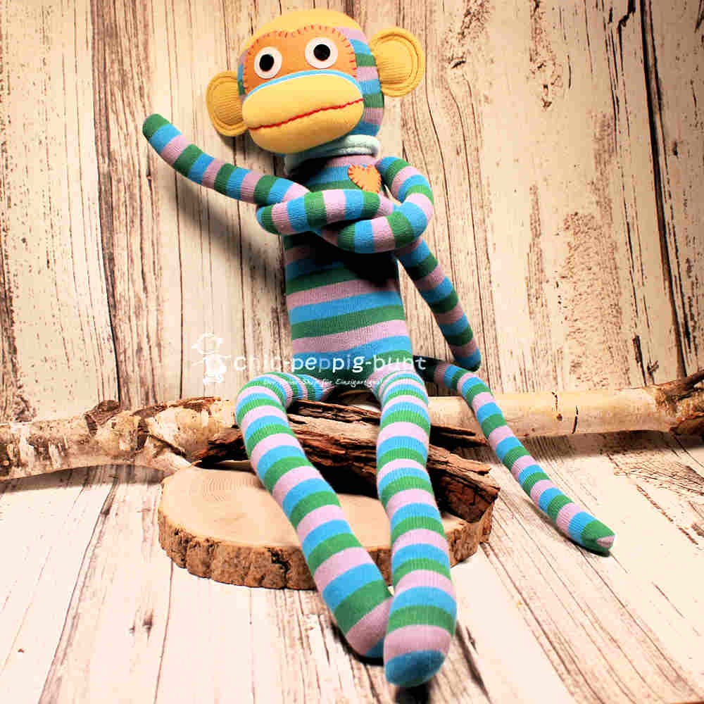 Riesengroßes Affentheater: Der XXL Sockenaffe in Grün-Blau-Grau