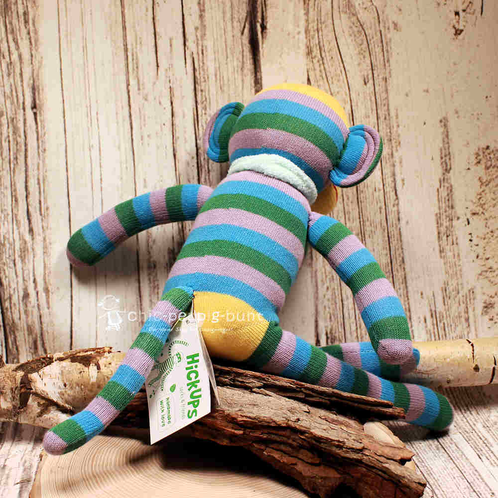 Dürfen wir vorstellen? Das ist der entspannte Typ unserer Sockenaffen-Gang! In seinem stylischen Streifen-Design aus Grün, Blau und Grau wirkt unser mittlerer Sockenaffe wunderbar modern und zeitlos zugleich. Mit einer Größe von 40 cm ist er weder zu klein noch zu wuchtig – er passt perfekt in den Kinderarm und ist immer bereit für eine Kuschelsession oder eine mutige Klettertour im Spielzimmer.