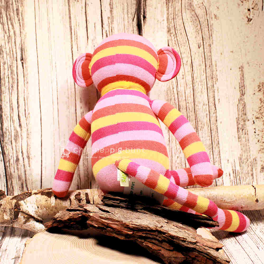 In jeder Bande gibt es diesen einen Typen, der immer die Ruhe bewahrt – das ist unser mittlerer Sockenaffe! Mit einer stolzen Größe von 40 cm ist er weder zu klein für große Umarmungen noch zu groß für den Kindergartenrucksack. Er bringt die gewohnte Farbenpracht in Rosa, Pink und Gelb direkt in dein Zuhause und wartet sehnsüchtig darauf, dein neuer bester Freund zu werden.